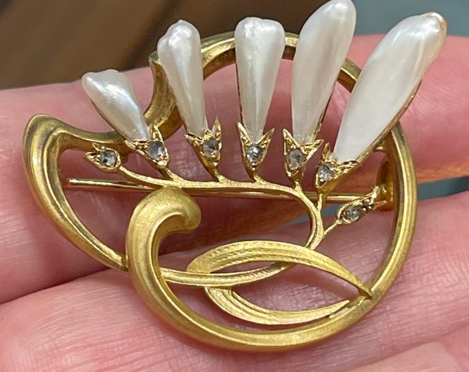 SOLD: Art Nouveau river pearl and diamond brooch, circa 1900