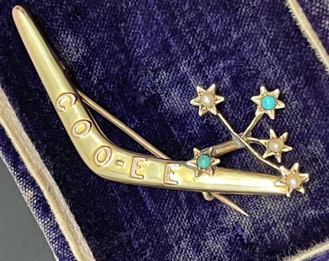 SOLD: Australian cooee boomerang brooch with turquoise and pearls, circa 1915