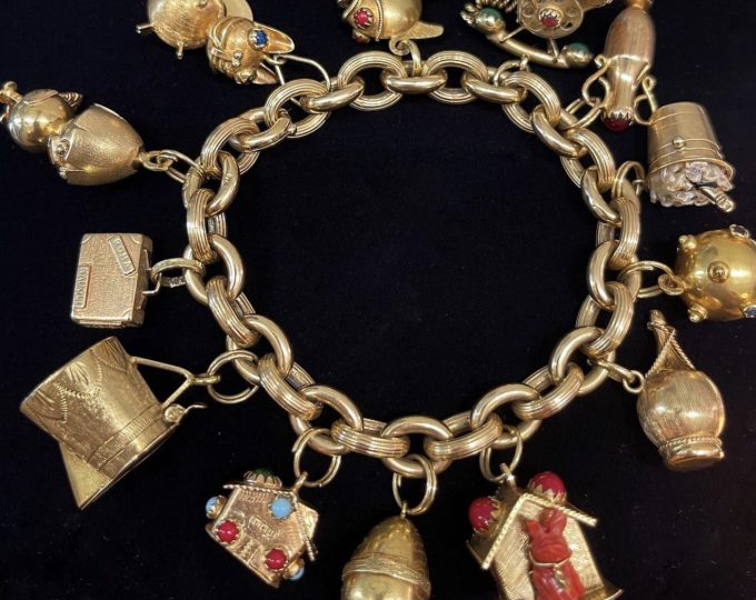 SOLD: Gold charm bracelet, eight inches, 73.5 grams, circa 1960