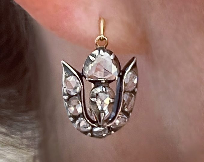 SOLD: Early Victorian rose cut diamond tulip earrings, circa 1840