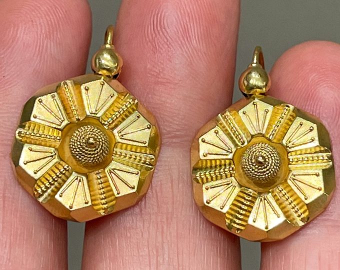 SOLD: Victorian Etruscan Revival gold earrings, circa 1880