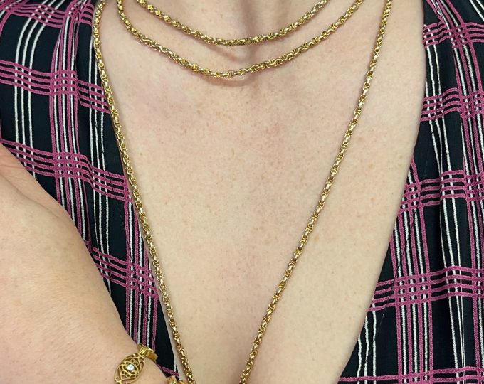 SOLD: Victorian gold guard chain, 58 inches, circa 1890