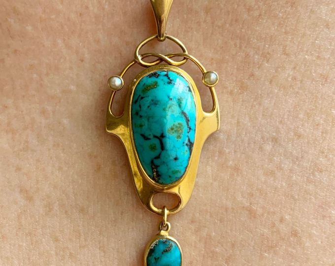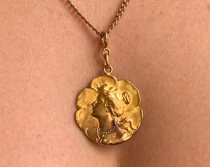 SOLD: Art Nouveau gold portrait pendant with rose cut diamonds, circa 1900