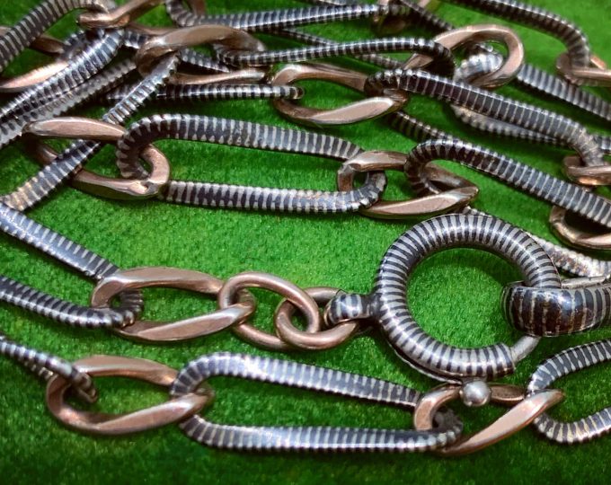 SOLD: Victorian niello sterling silver chain with rose gold, circa 1900