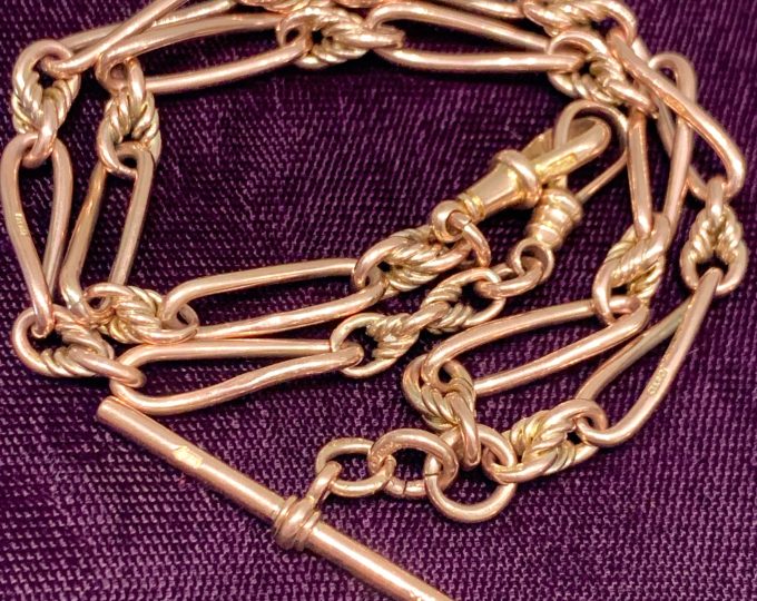 SOLD: Victorian rose gold watch chain with twisted long links and knots, circa 1900