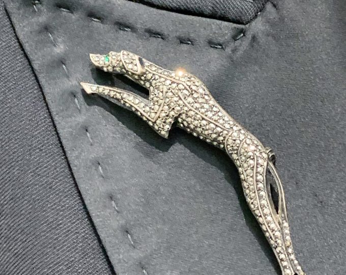 SOLD: Art Deco marcasite and sterling silver greyhound brooch, circa 1930