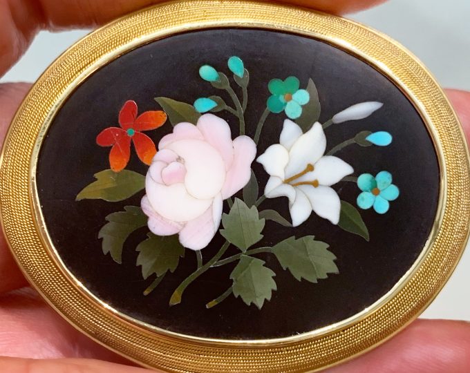 SOLD: Large floral pietra dura brooch with gold frame, circa 1880