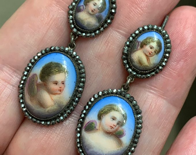 SOLD: Mid-Victorian painted porcelain and cut steel earrings, circa 1870