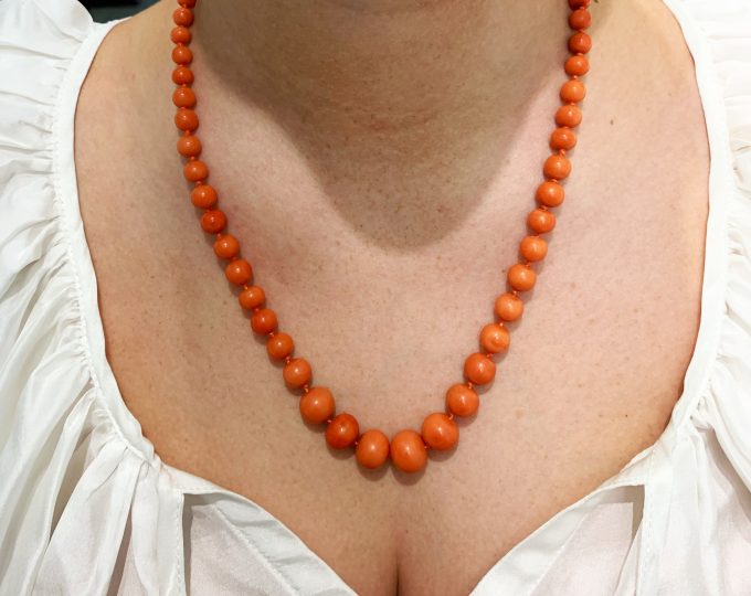 SOLD: Graduated coral bead necklace with gold clasp, 21 1/2 inches, 19th century