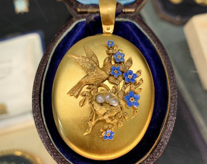 SOLD: Victorian gold locket with bird, natural pearls and flowers by Harry Emanuel, 1855-73