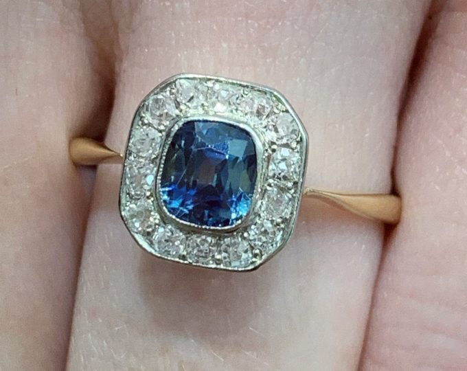 SOLD: Sapphire and diamond halo cluster ring, circa 1930