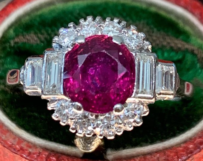 SOLD: Late Art Deco ruby ring with round and baguette diamonds, circa 1940