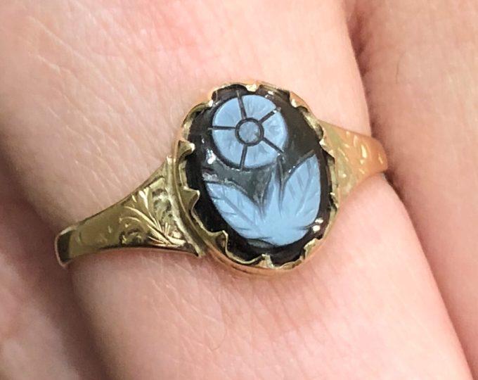 SOLD: Victorian mourning ring with carved onyx forget-me-not, hallmarked Birmingham 1870