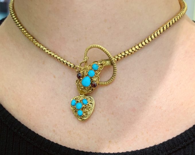 SOLD: Mid-Victorian turquoise and garnet snake necklace, circa 1870