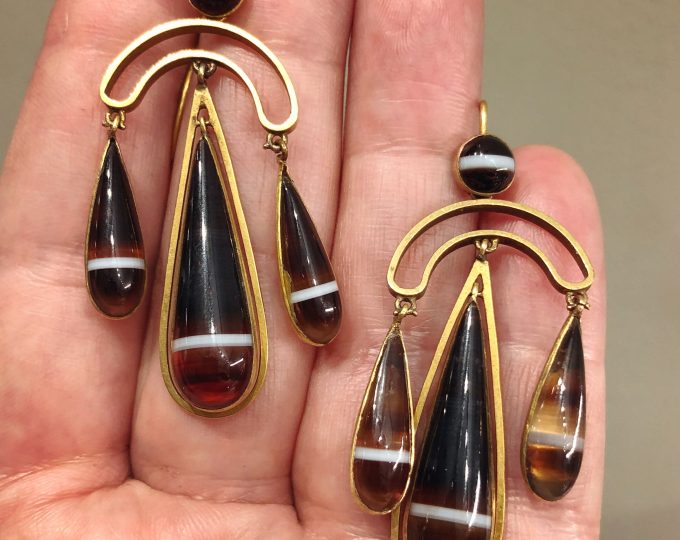 SOLD: Mid-Victorian banded agate and gold girandole earrings, circa 1870