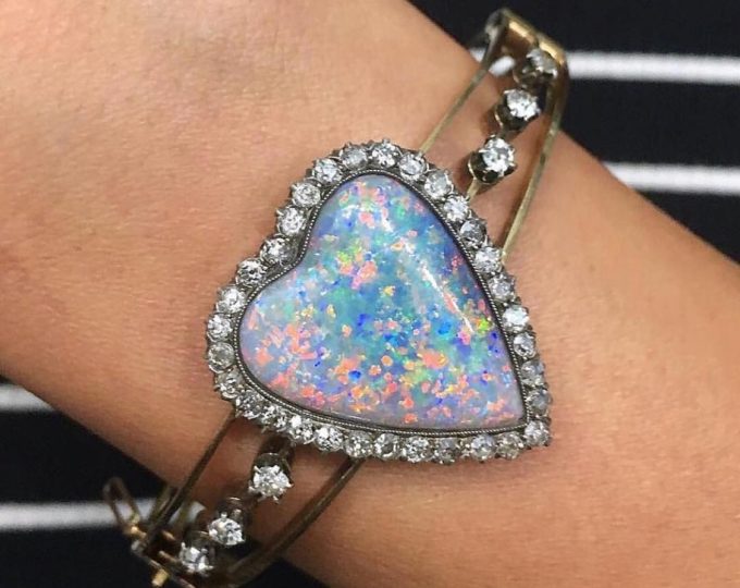 SOLD: Victorian black opal heart locket bangle with diamonds, circa 1900