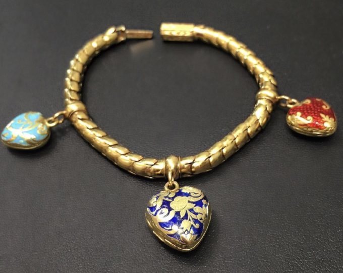 SOLD: Mid-Victorian gold bracelet with enamelled heart lockets, circa 1845