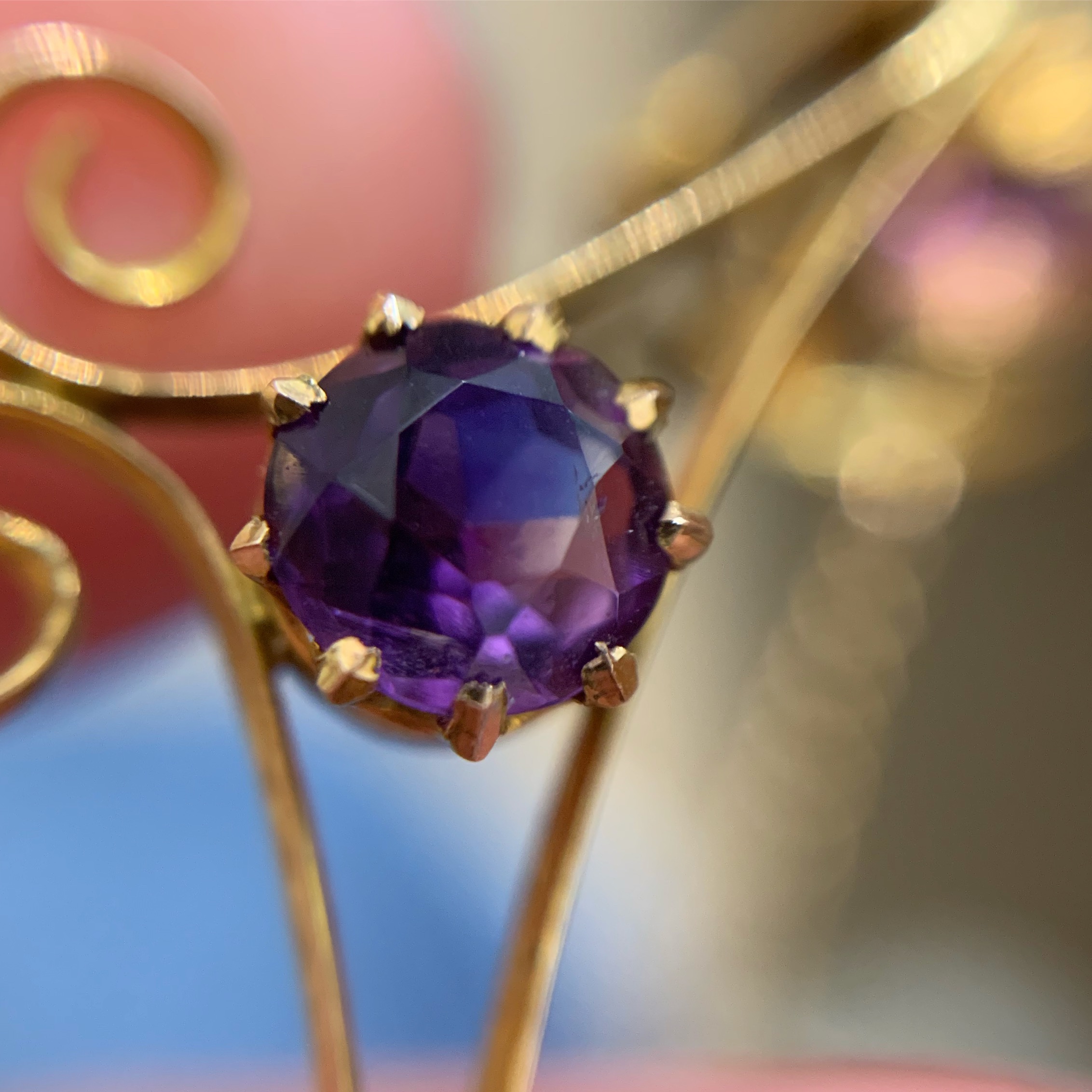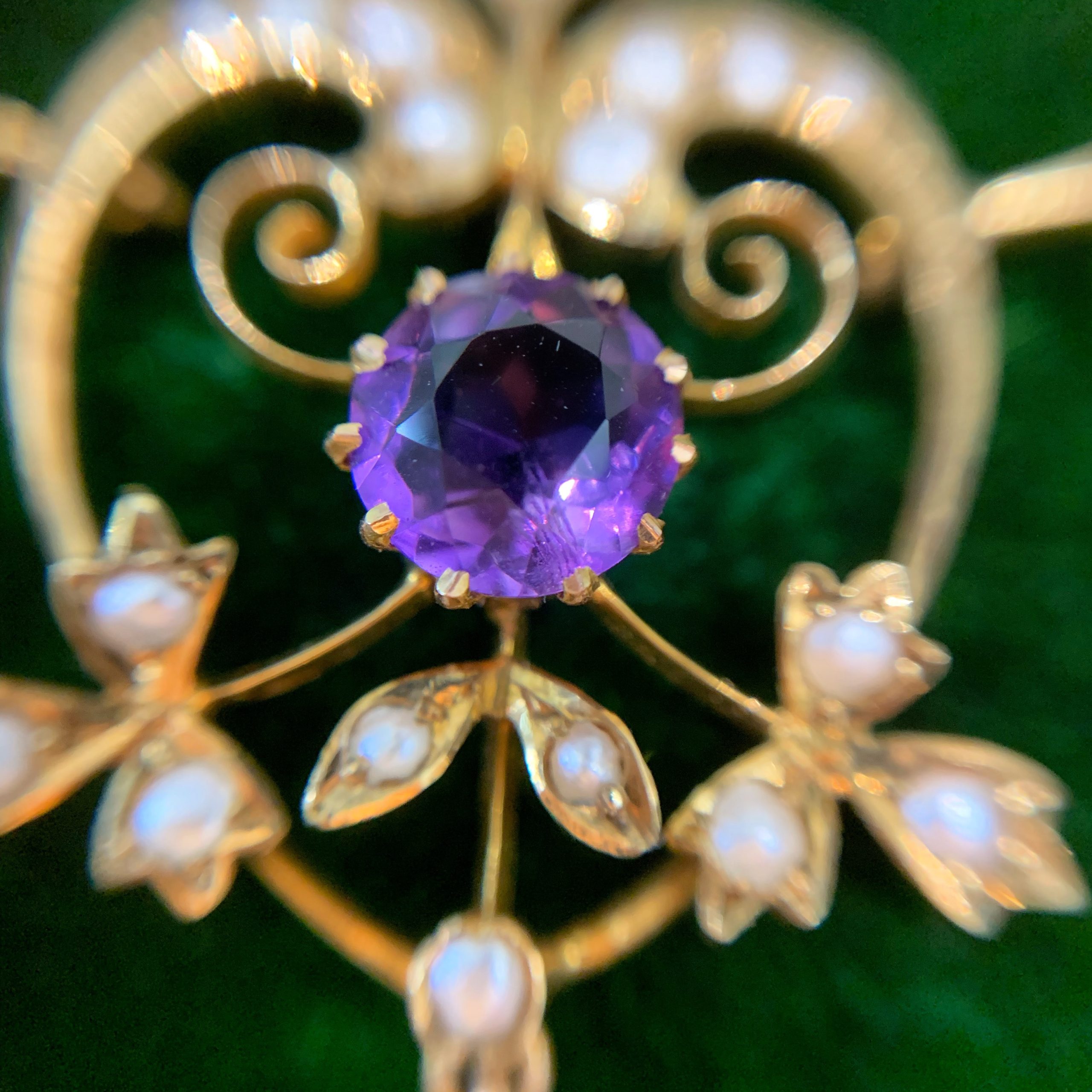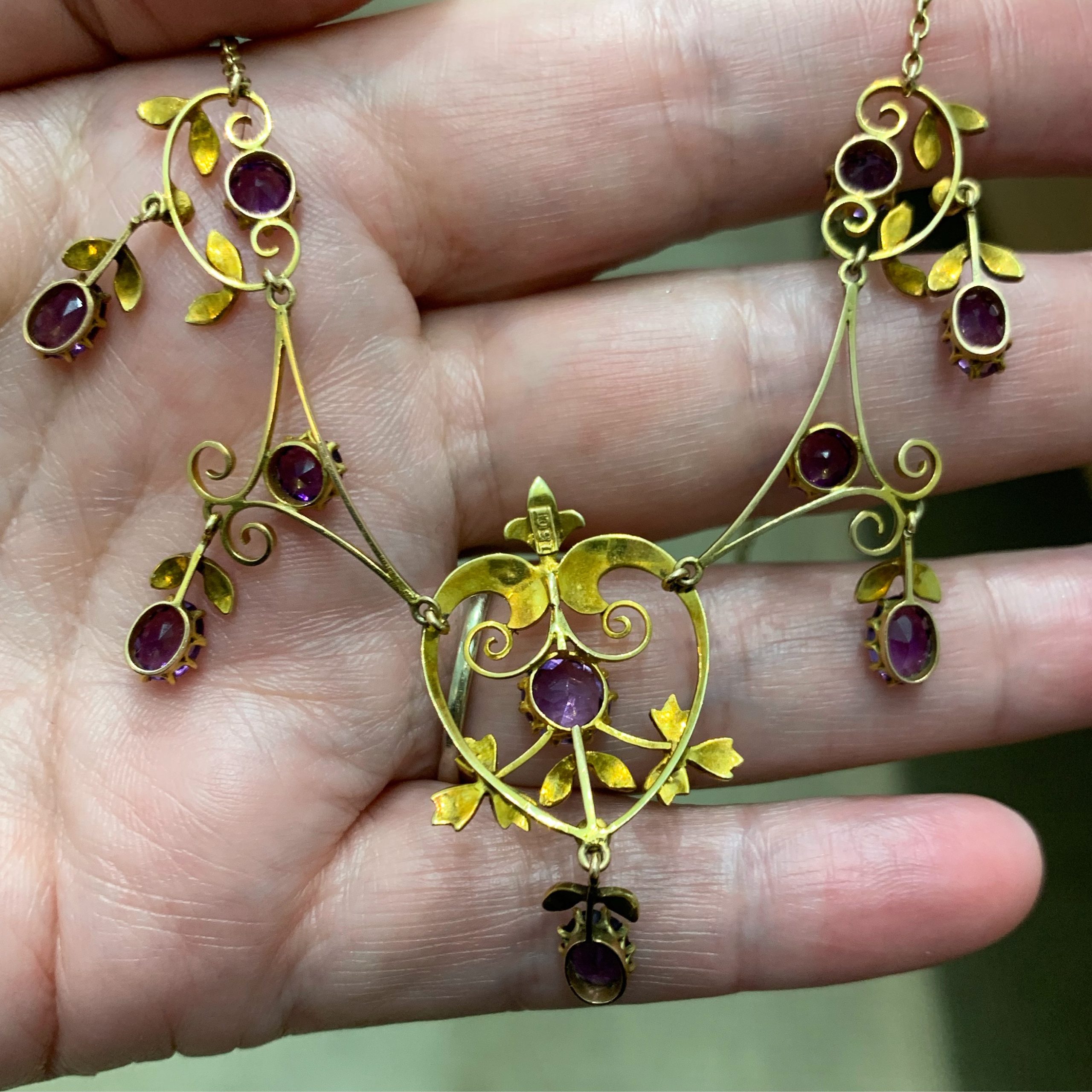 It is fashioned in 15-carat gold and set with amethysts and half pearls. Half pearls were also used in 19th century jewels, but here the gold settings are lighter and more attenuated.