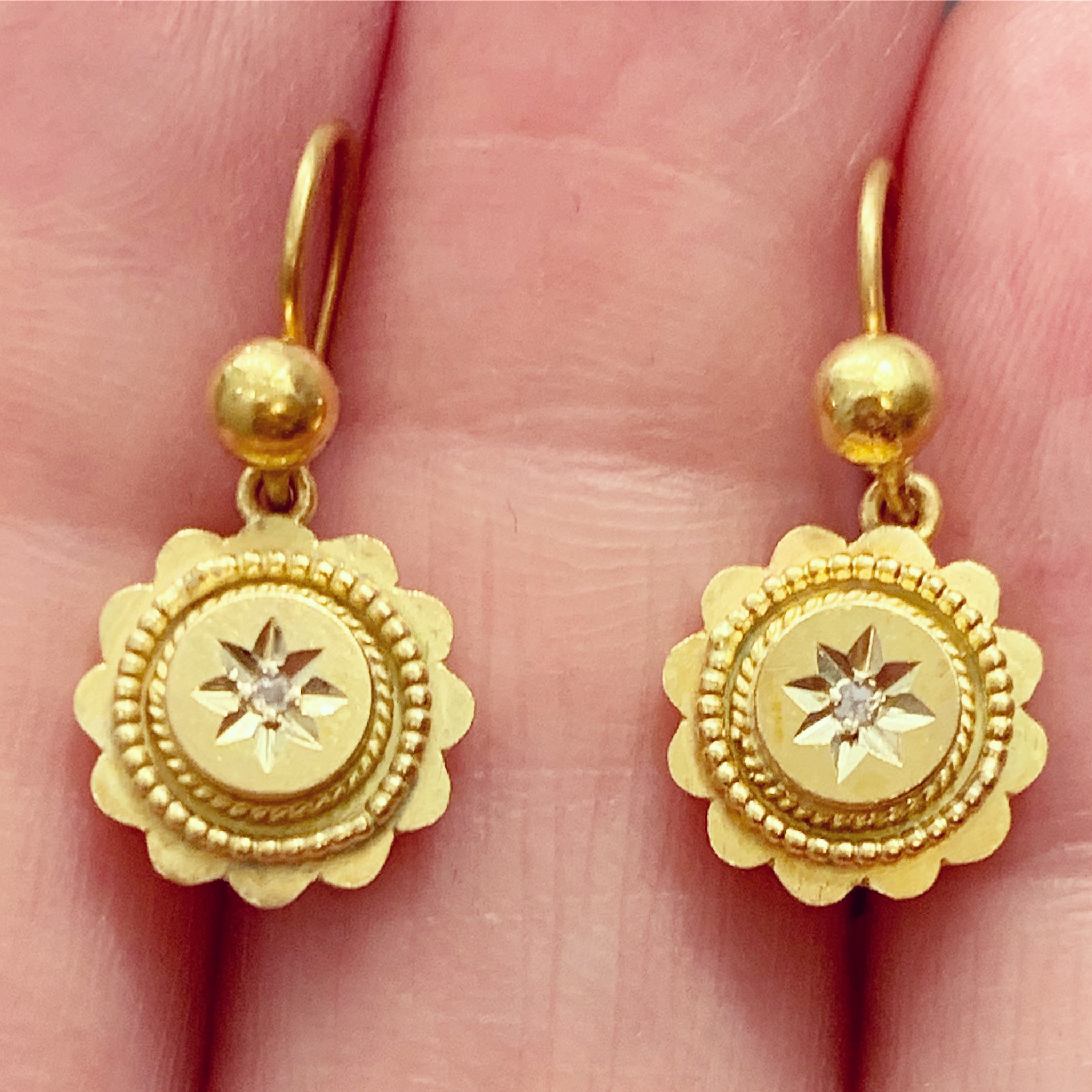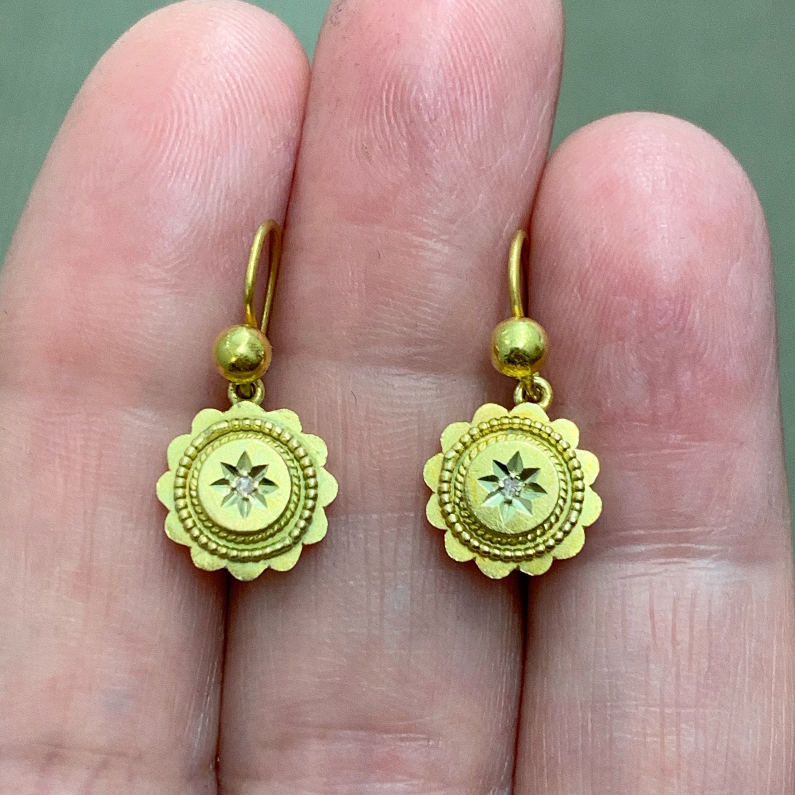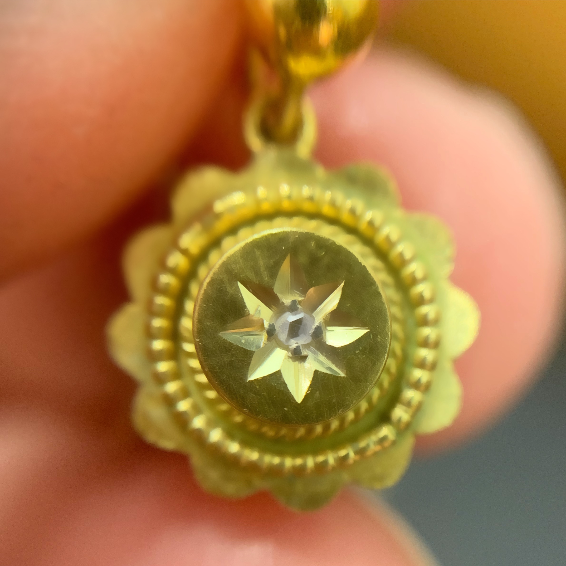 >Here we have a pair of late Victorian yellow gold earrings, each set with a tiny central rose cut diamond.