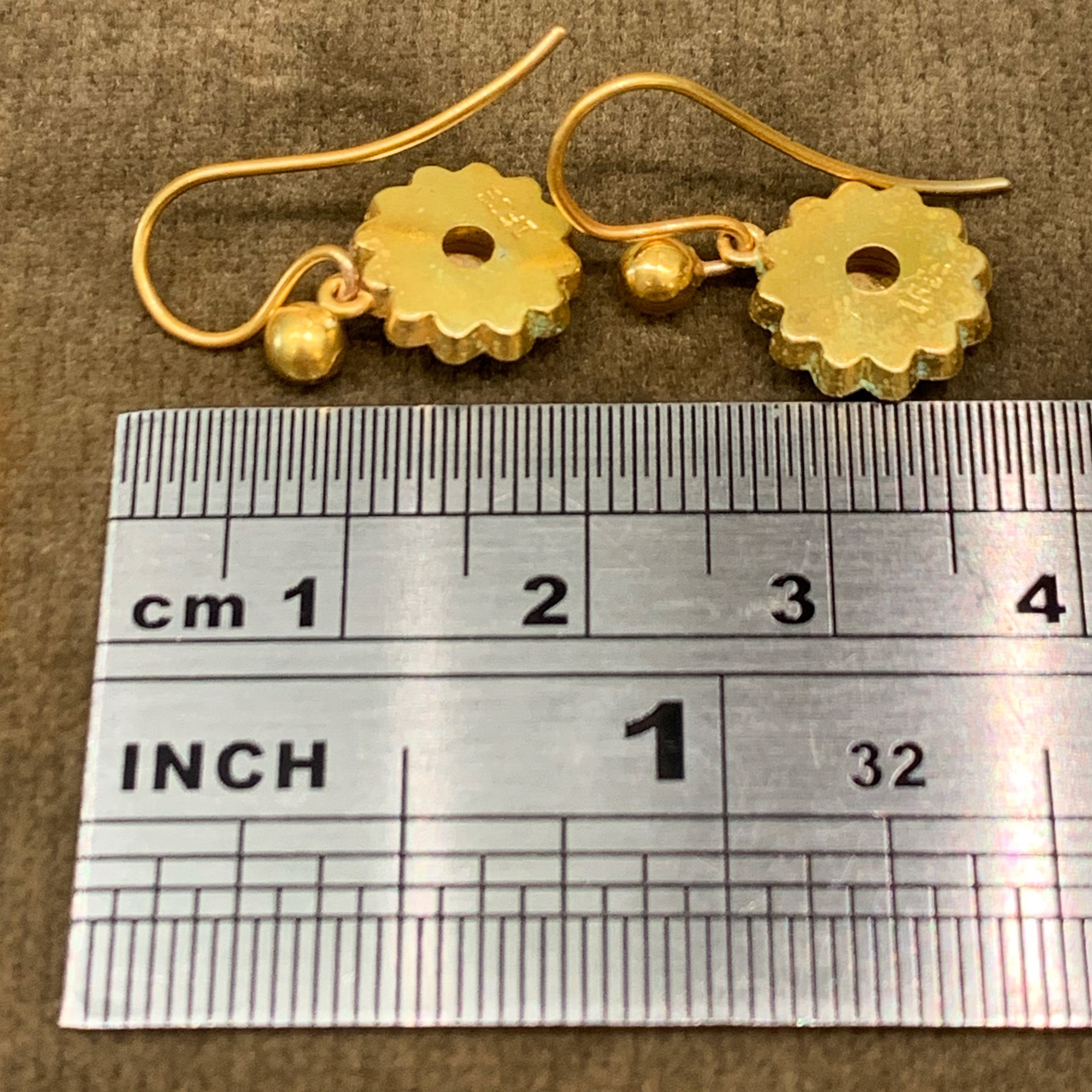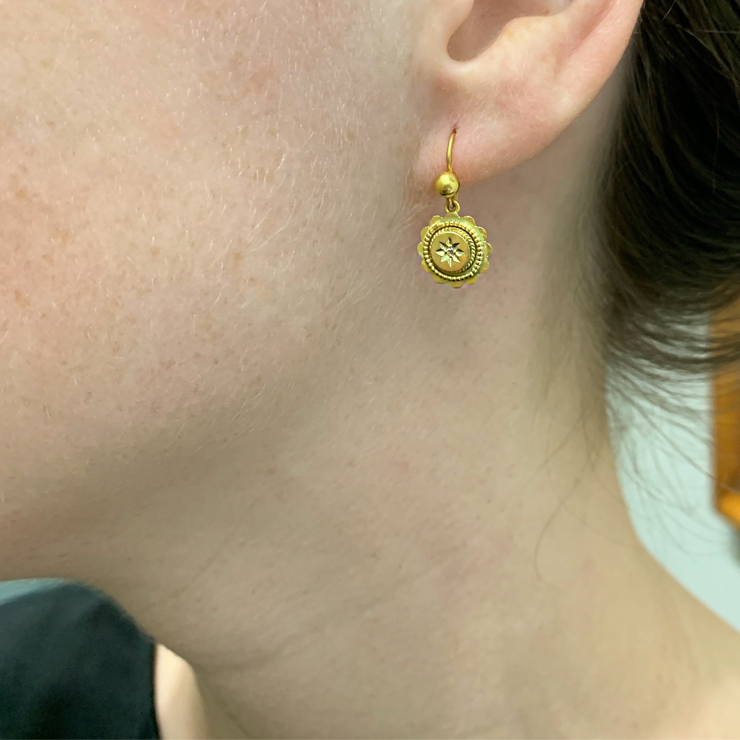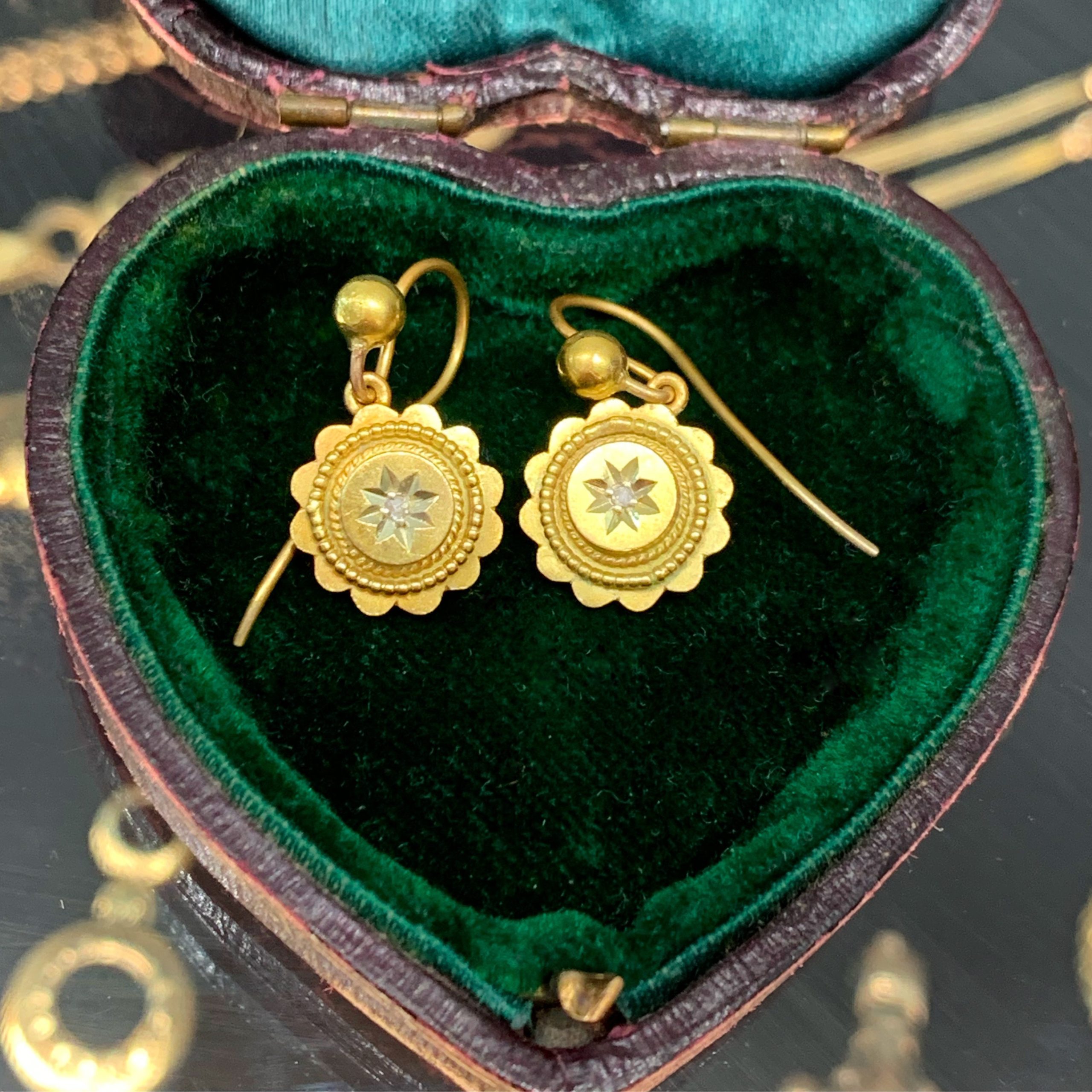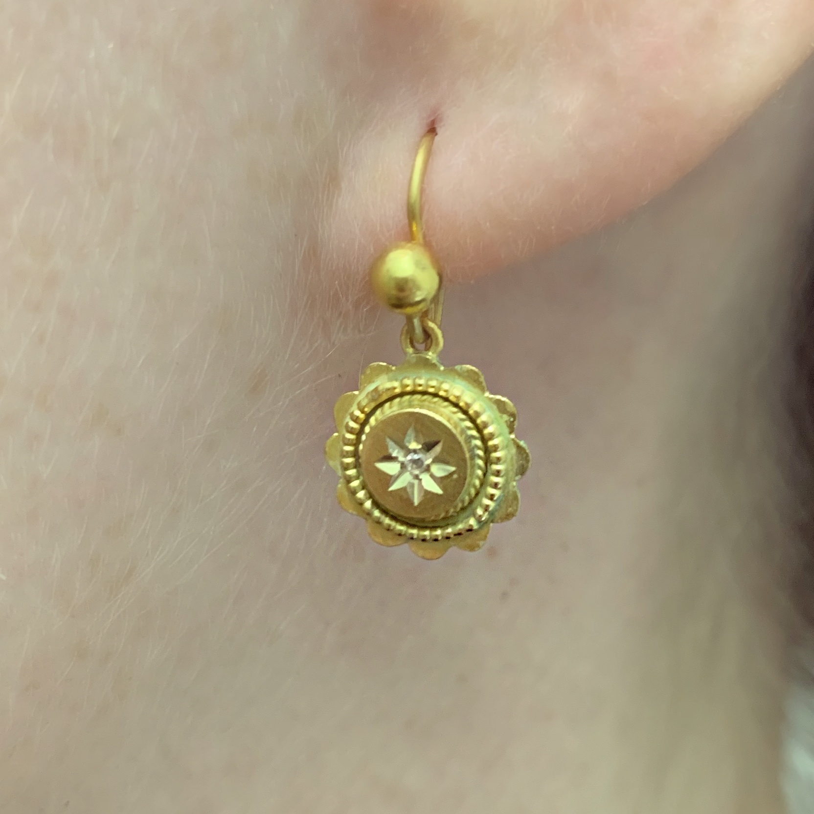 >Here we have a pair of late Victorian yellow gold earrings, each set with a tiny central rose cut diamond.