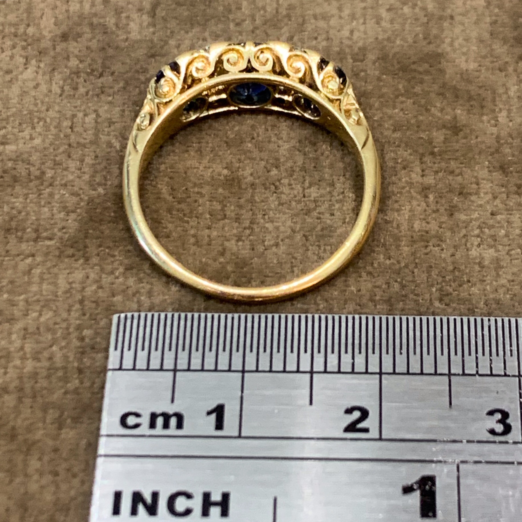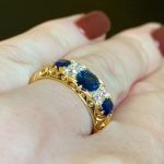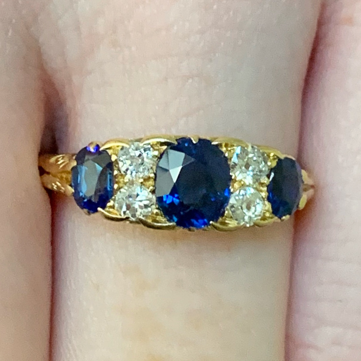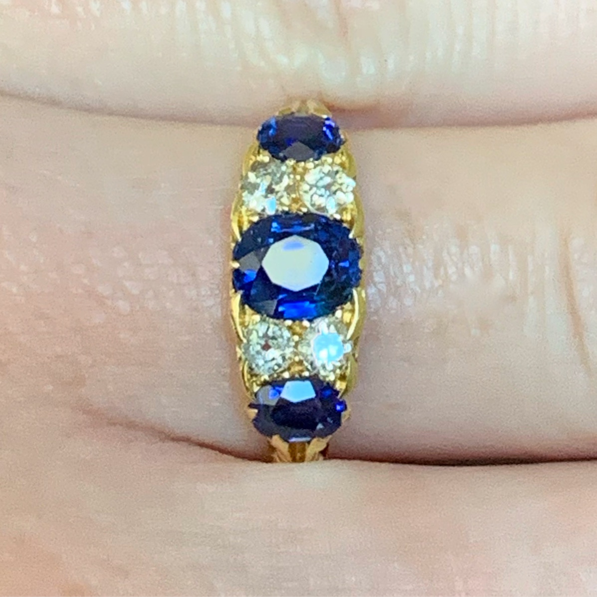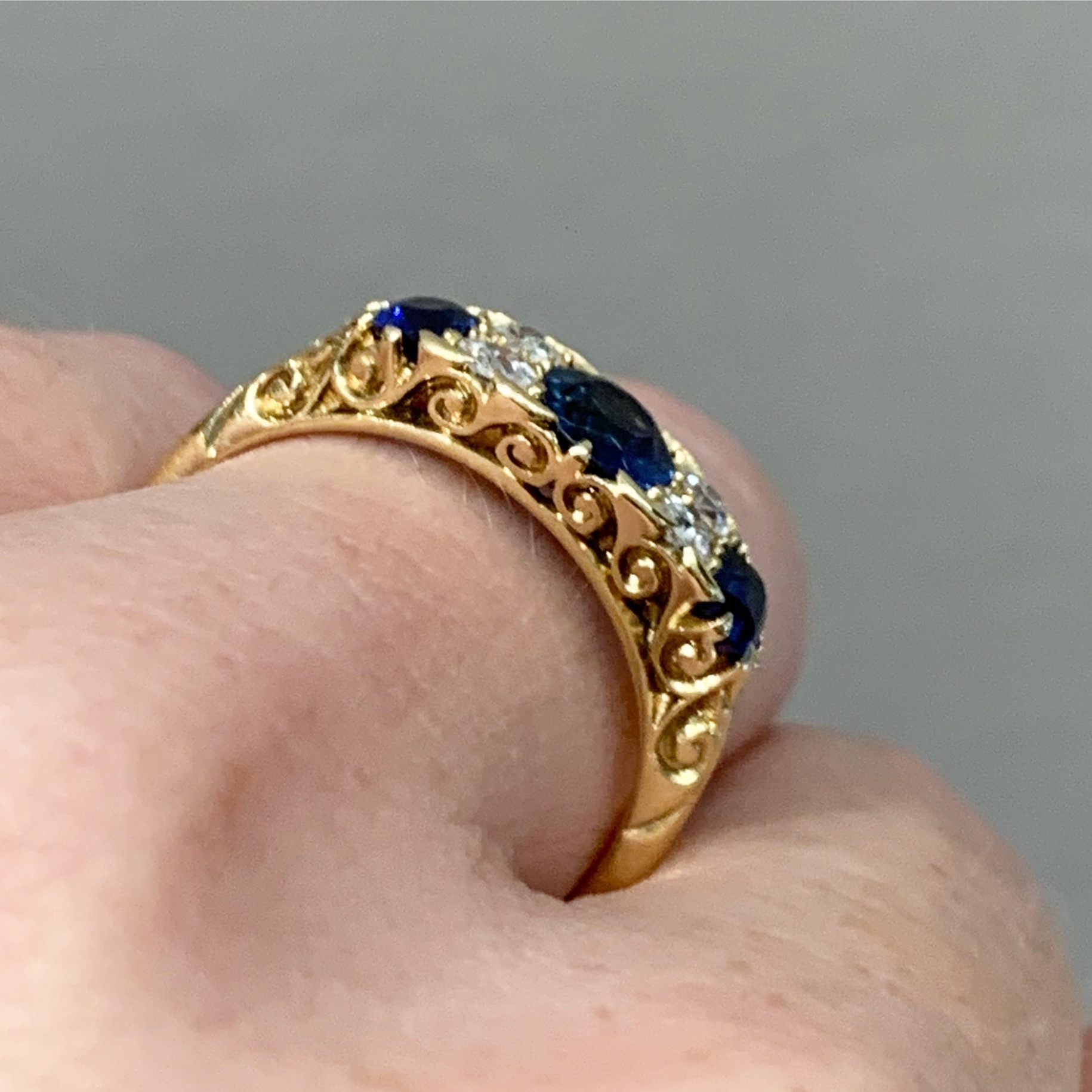 SOLD: Victorian seven-stone sapphire and diamond carved half hoop ring, circa 1900
