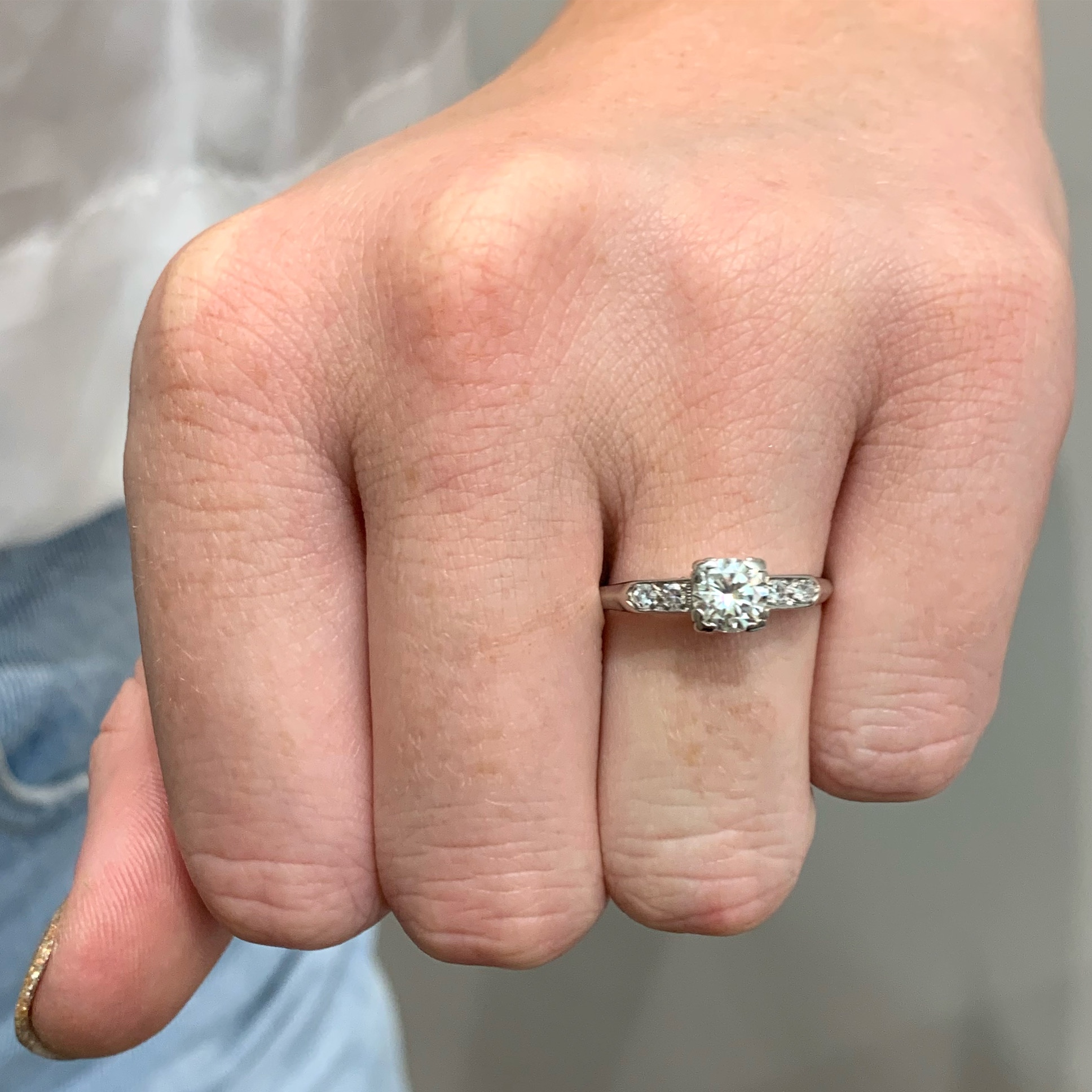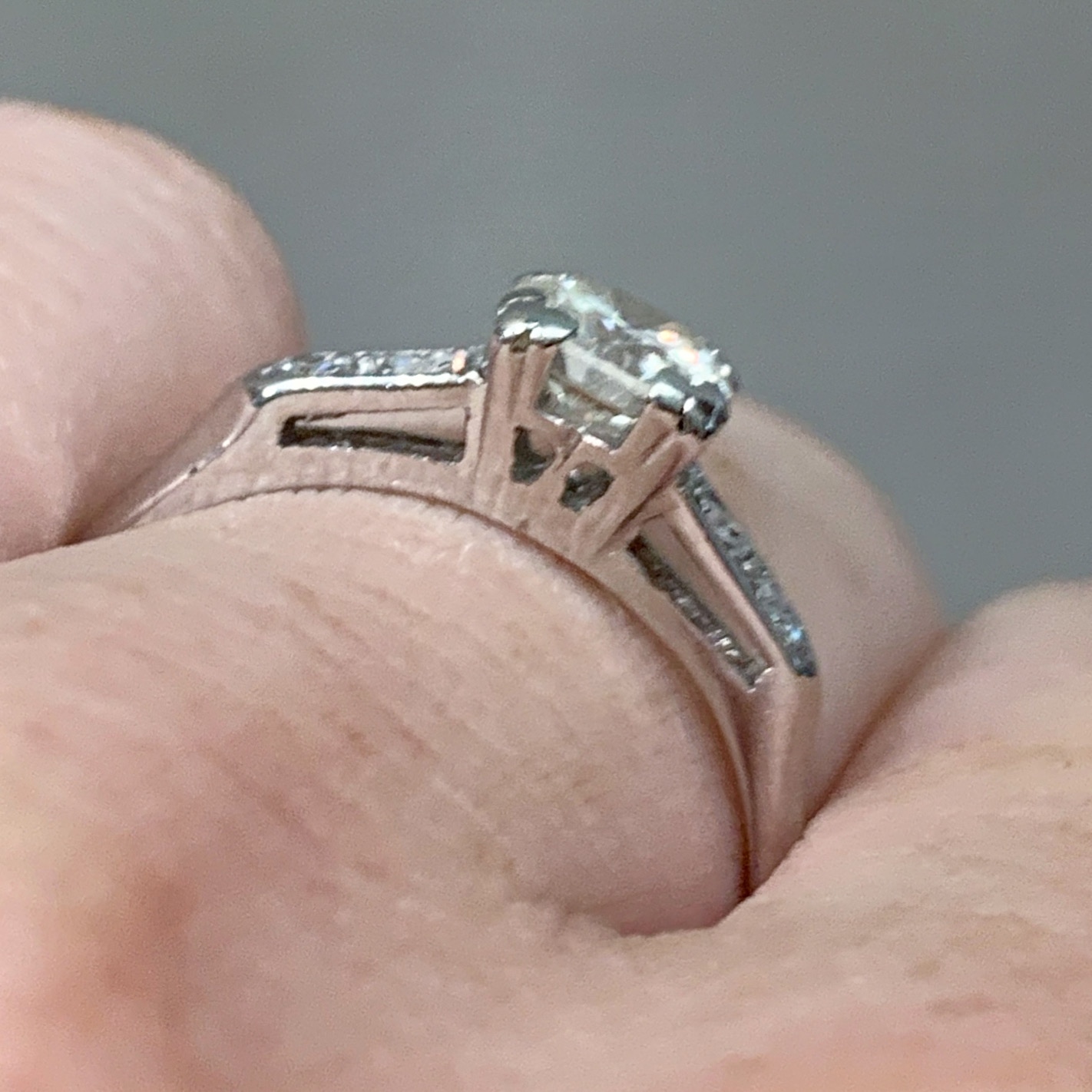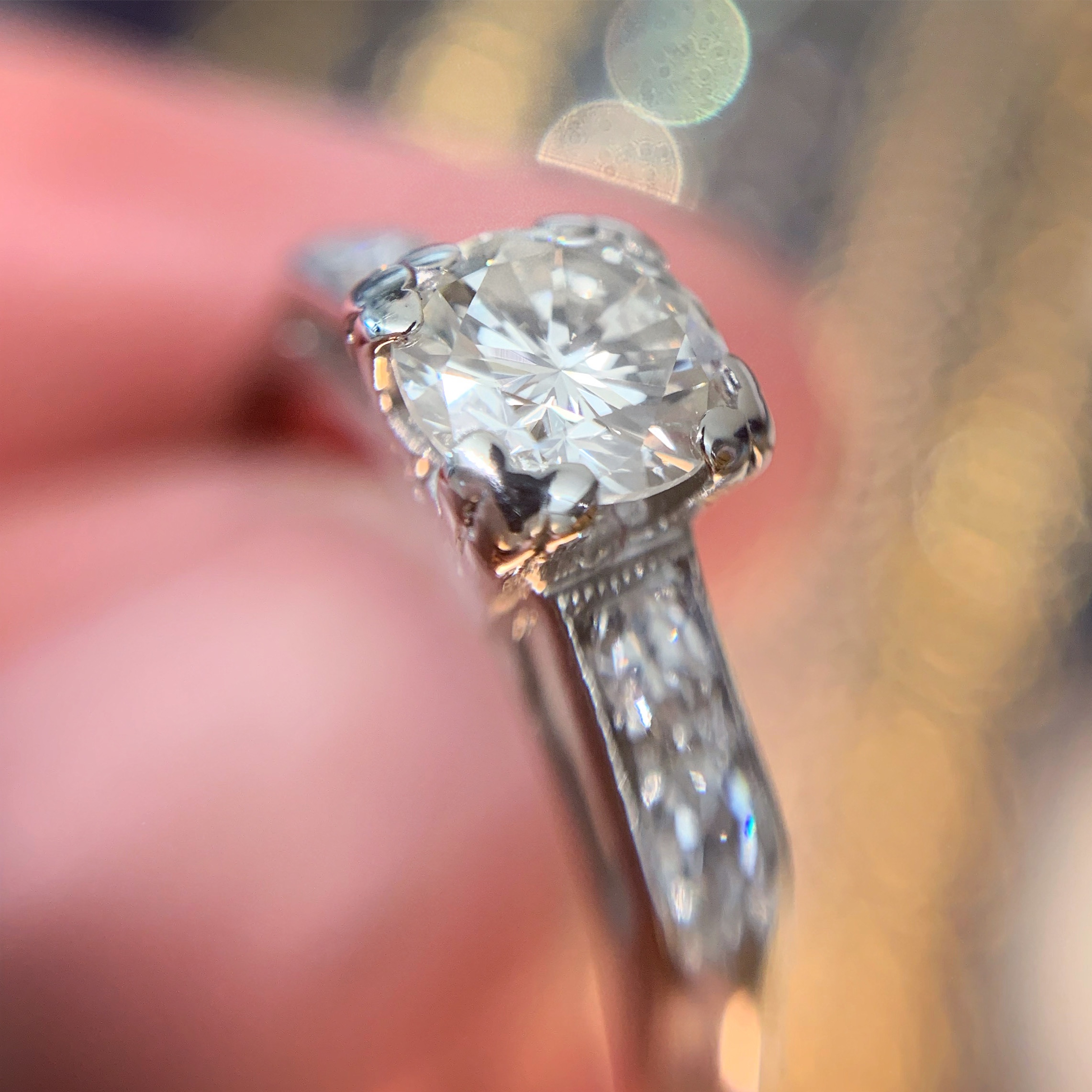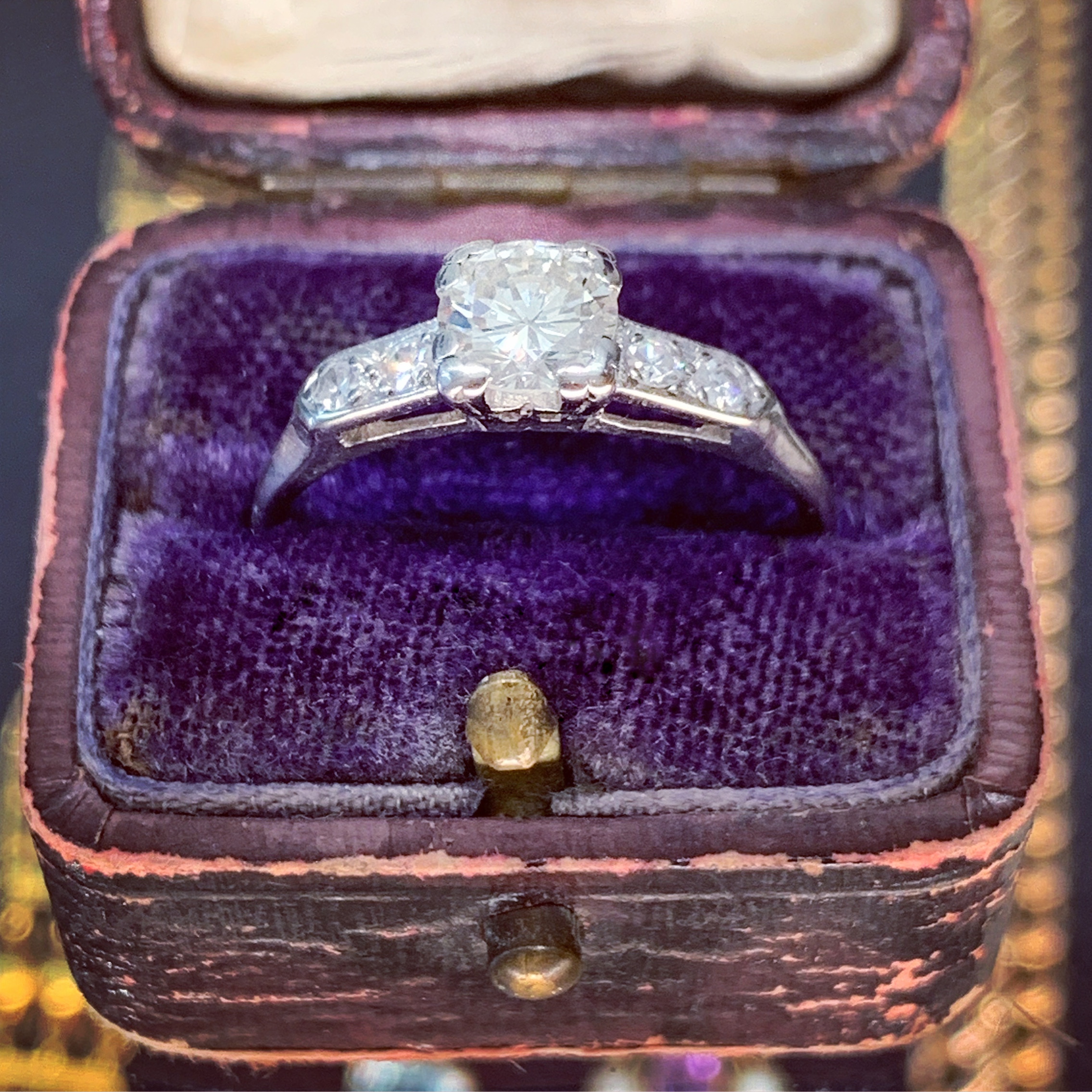 Are you looking for an Art Deco engagement ring? This handcrafted platinum one features a round brilliant cut diamond in a square setting.