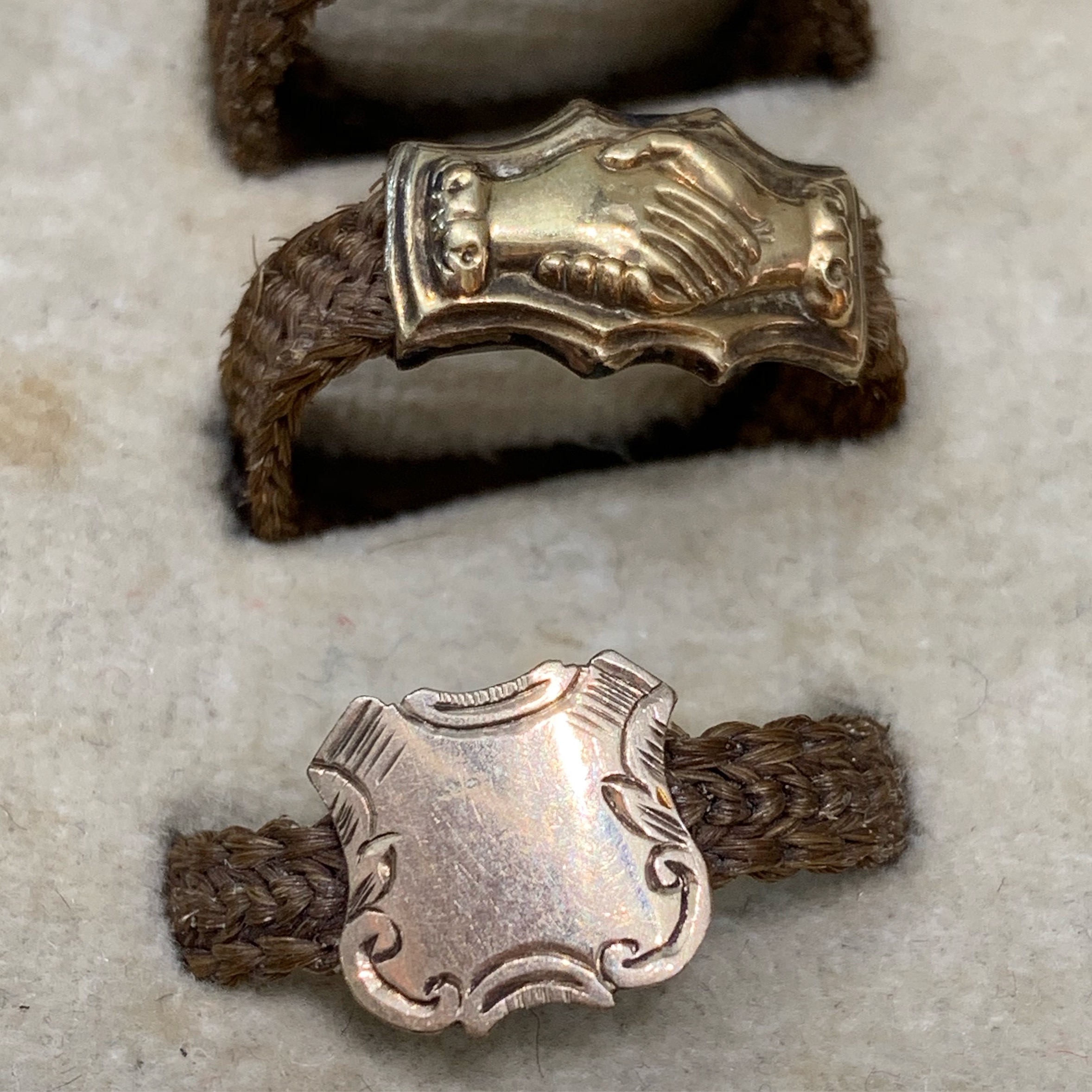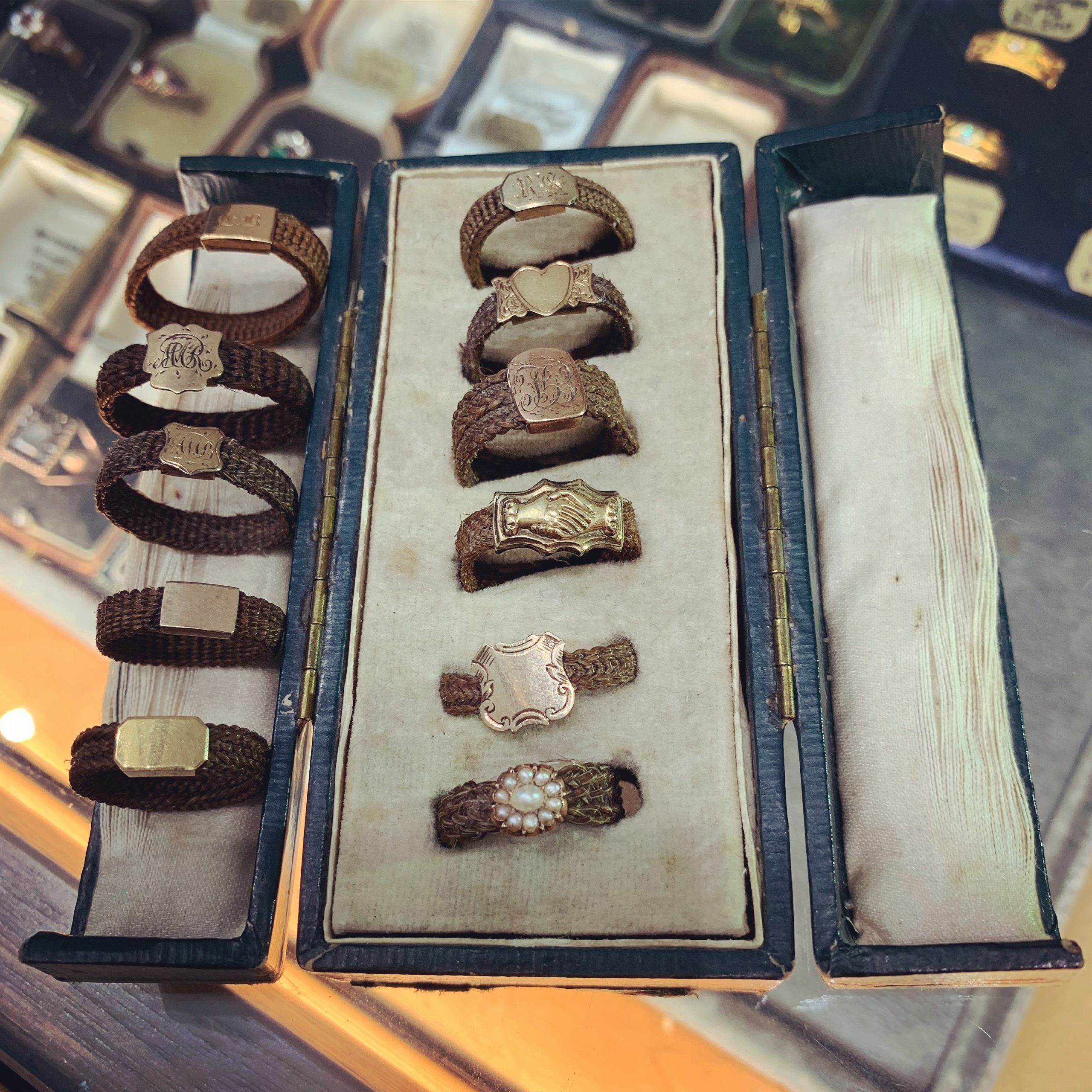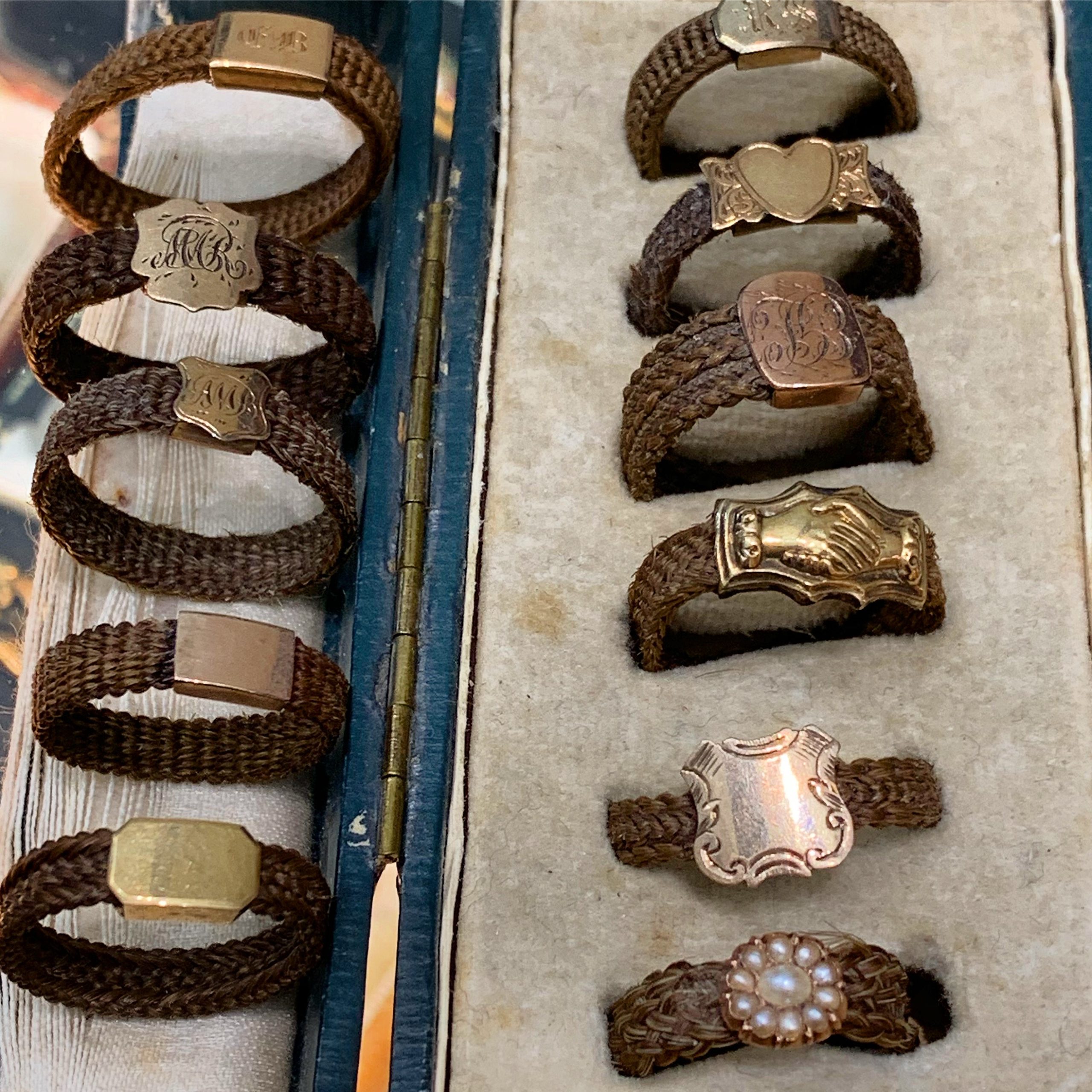 Here is a collection of 19th century mourning rings made from woven hair.