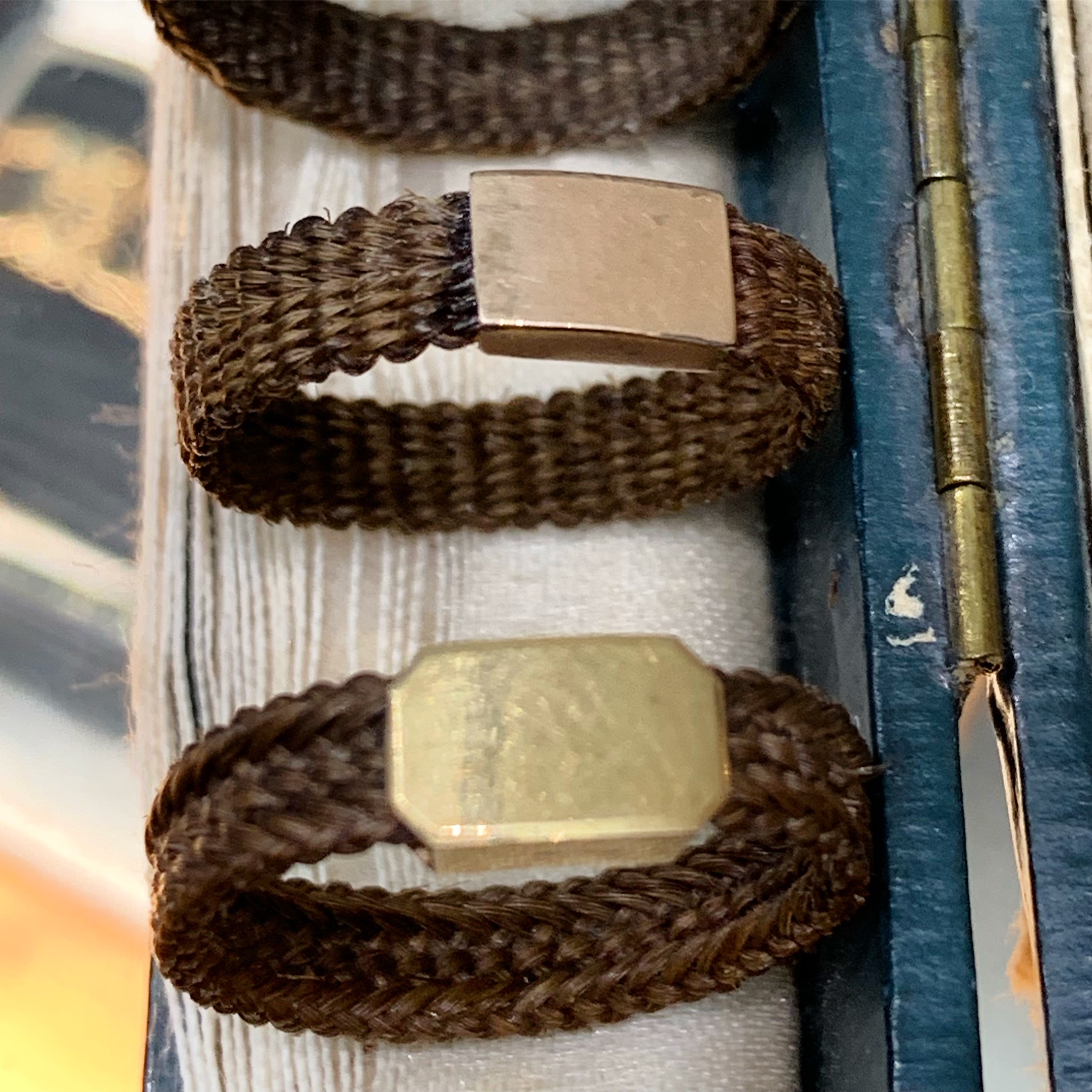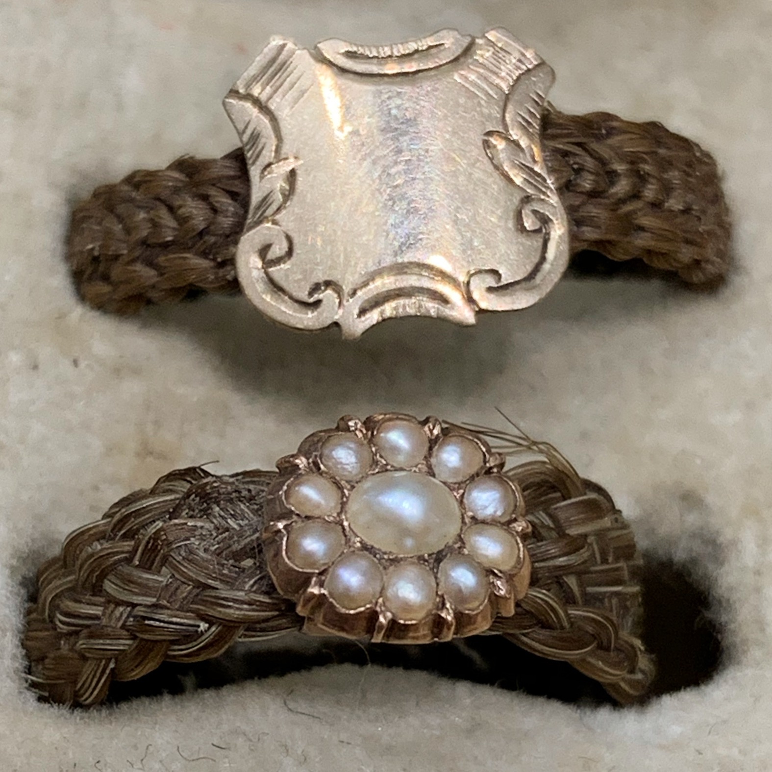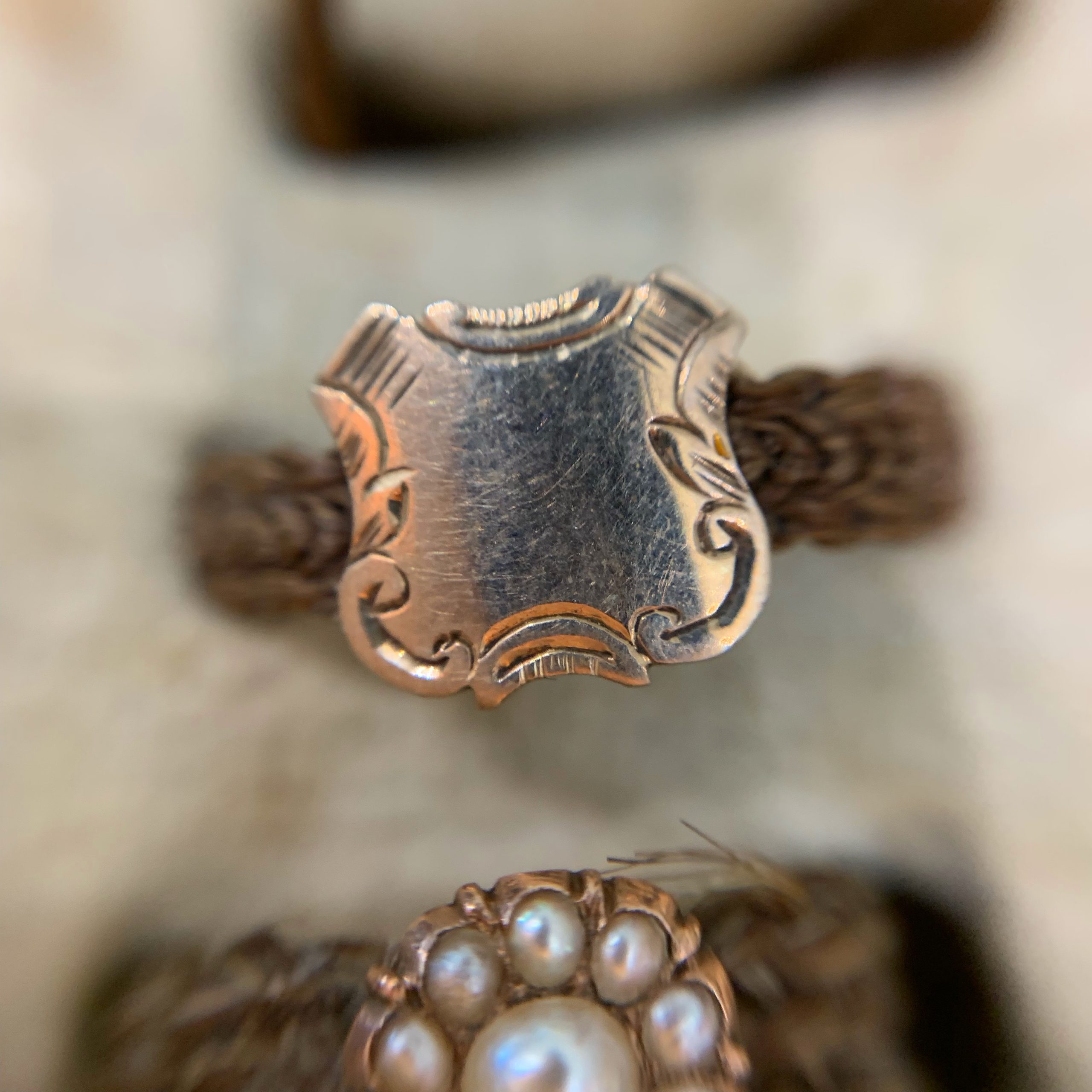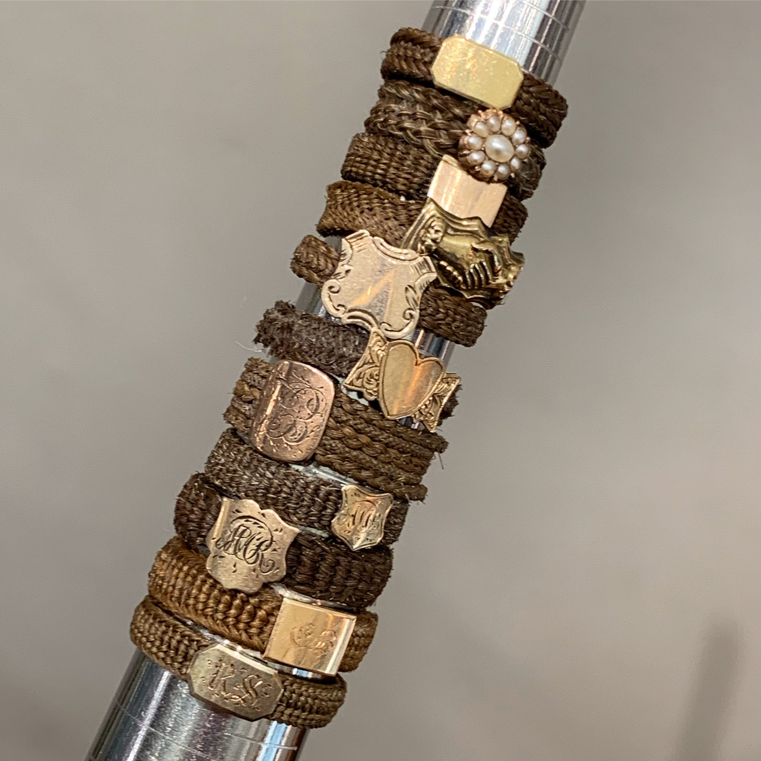 Here is a collection of 19th century mourning rings made from woven hair.