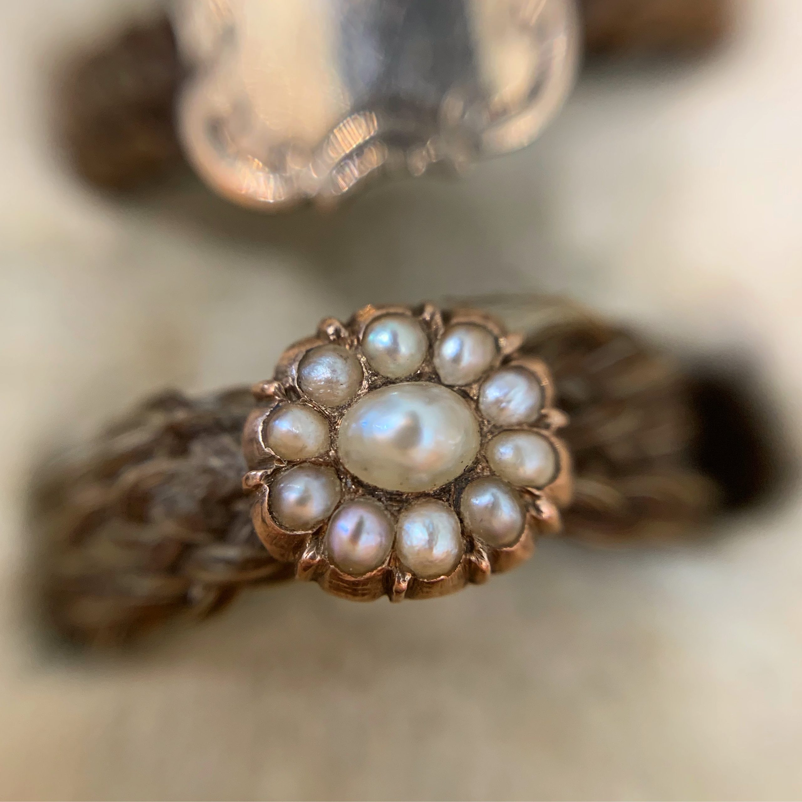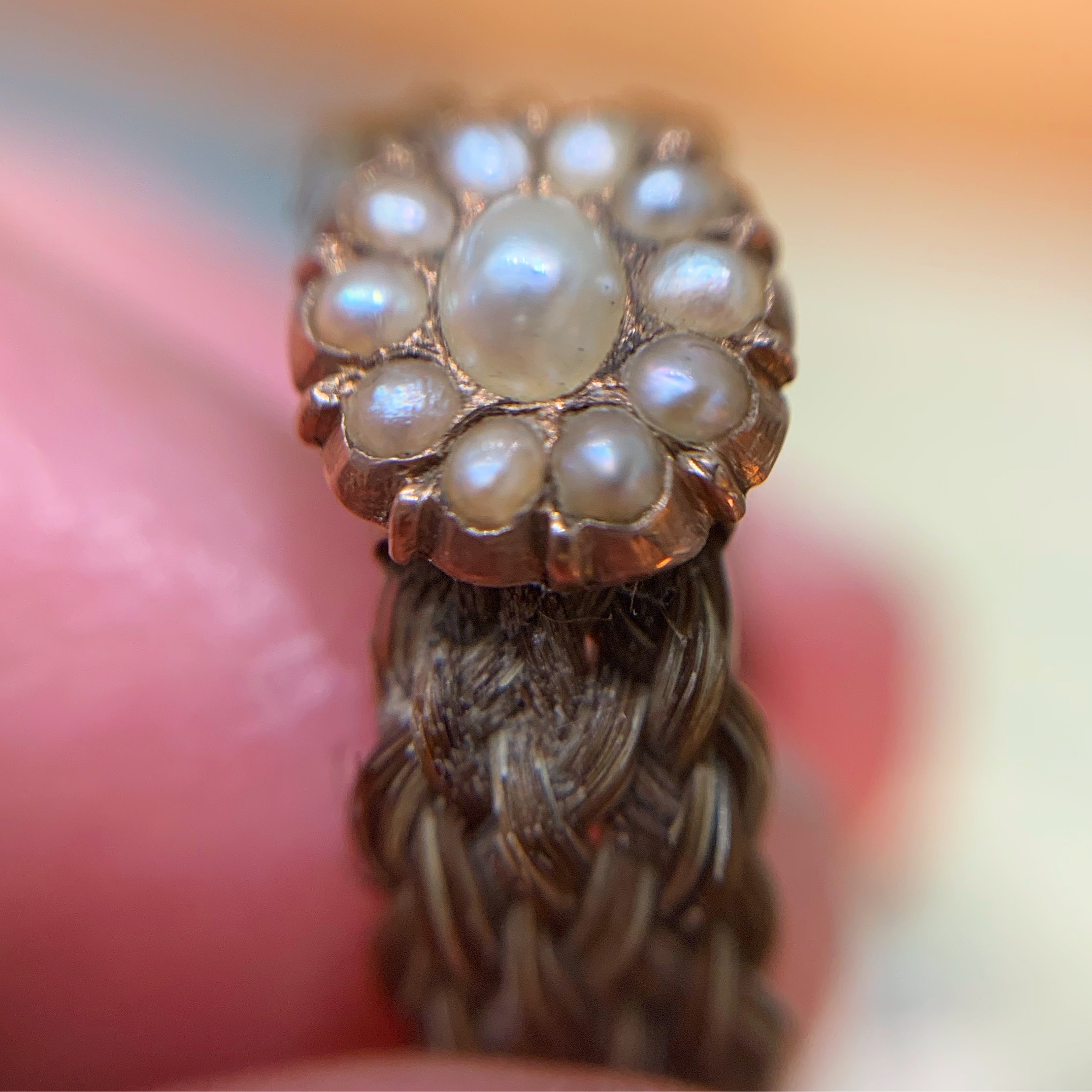 SOLD: Collection of 11 hair rings, with gold and natural pearls, in antique box, 19th century