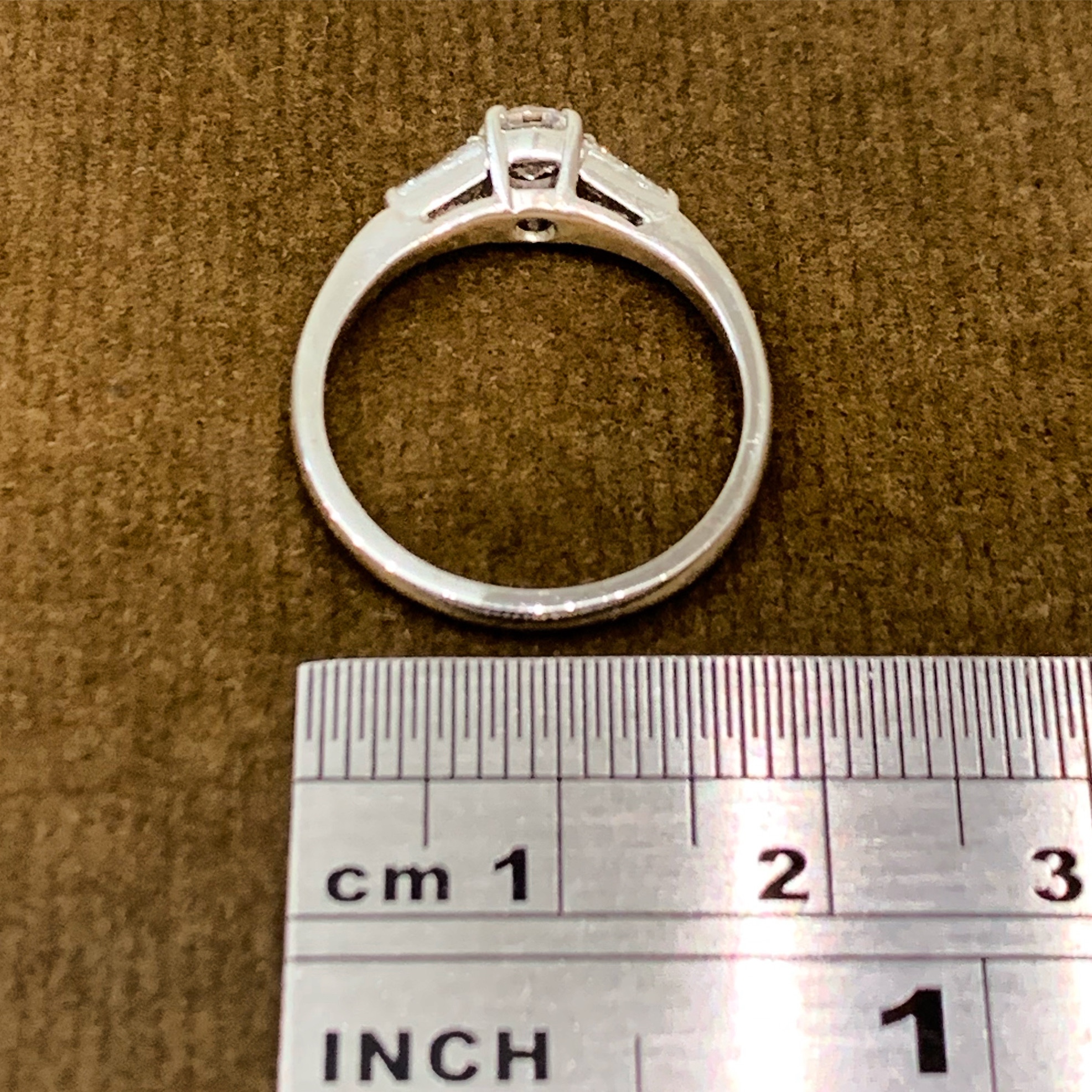 The central round brilliant diamond has a tapered baguette on each side; they blend into the surrounding band.