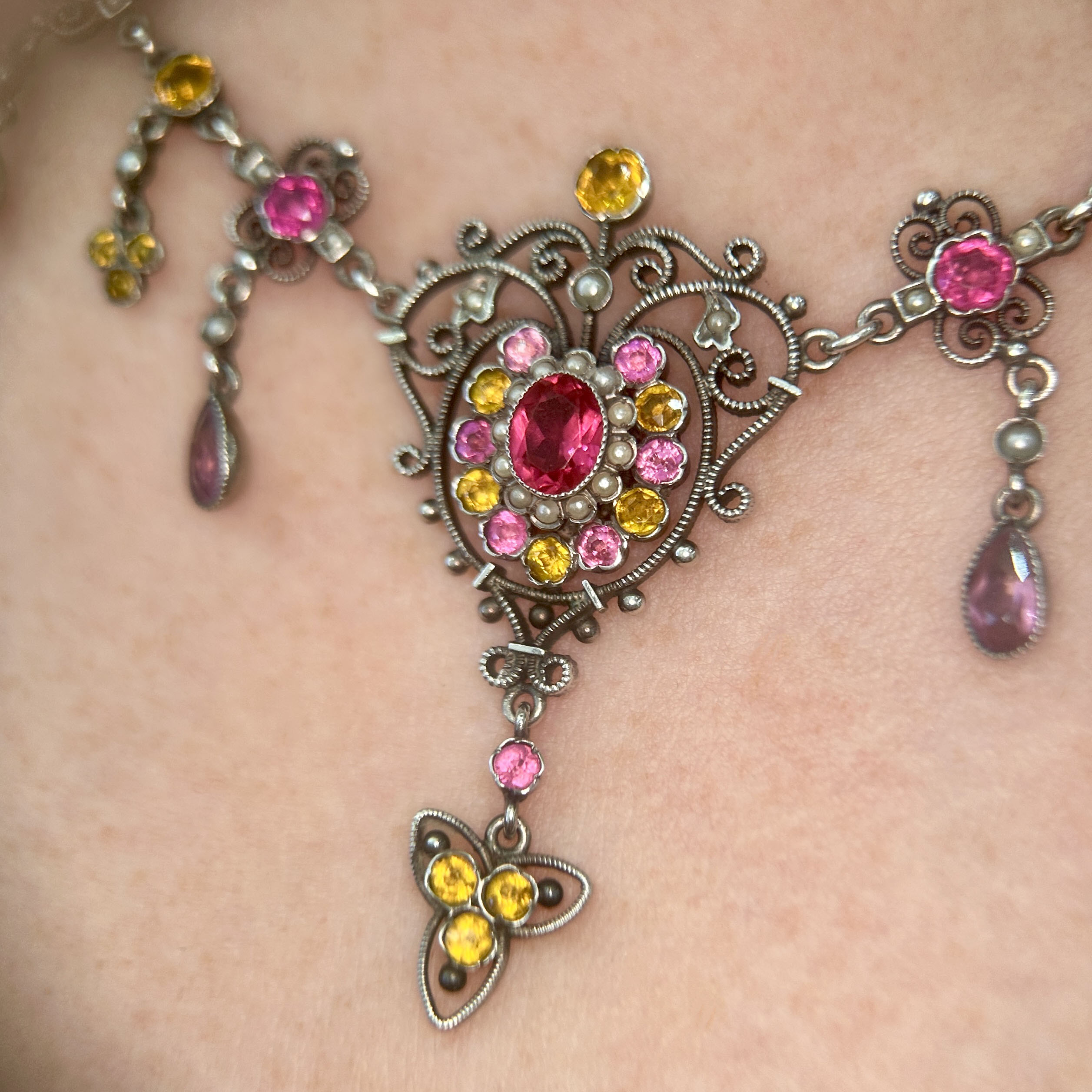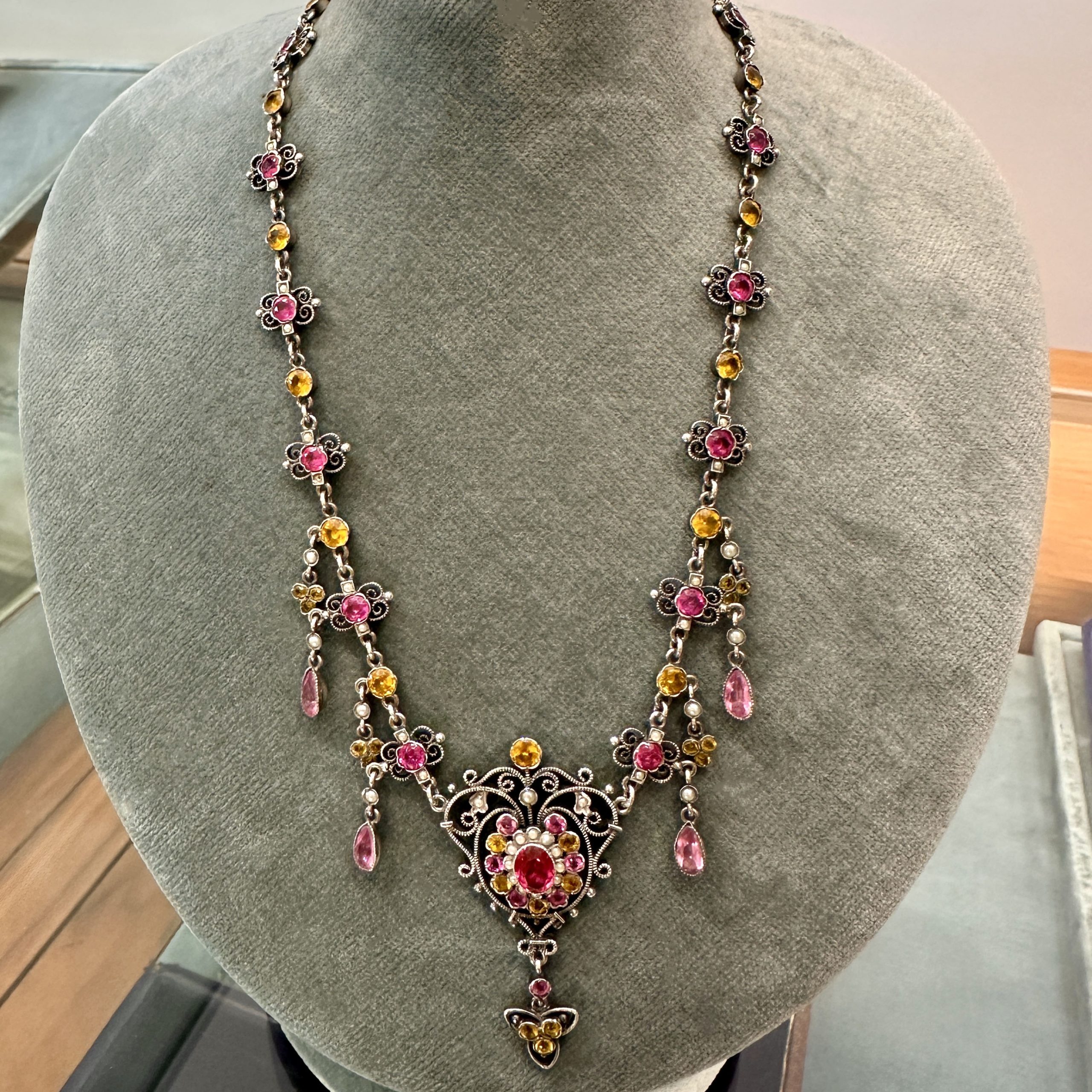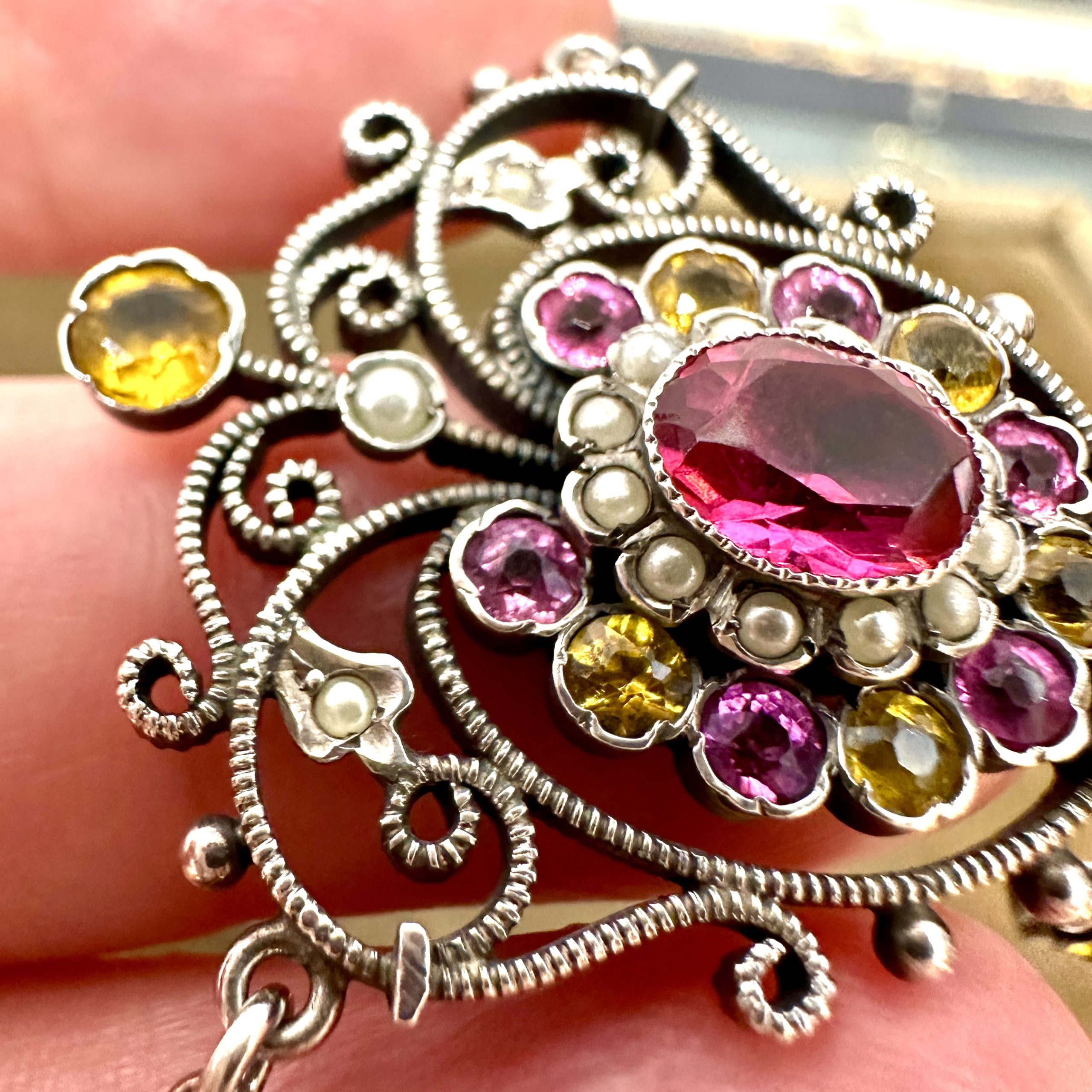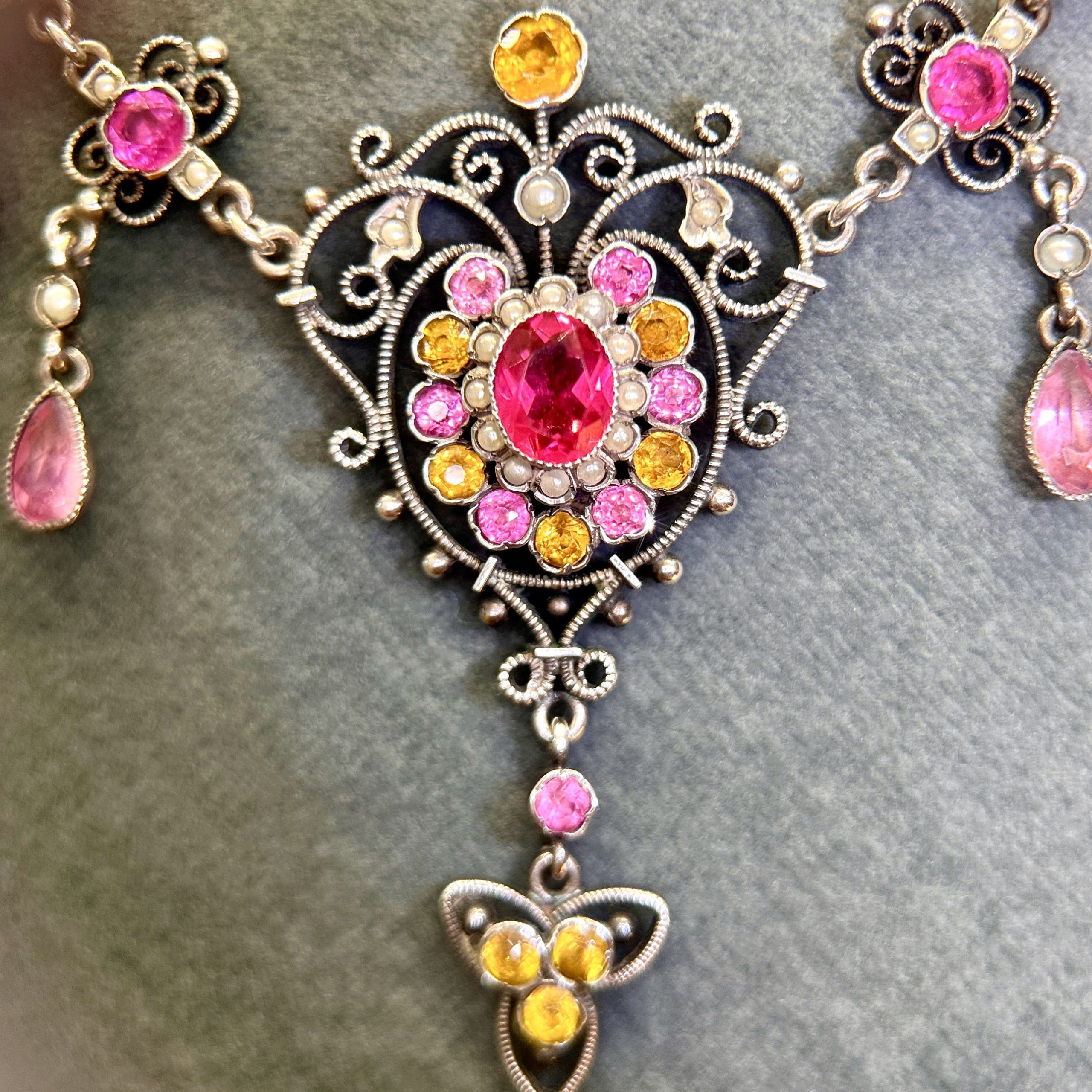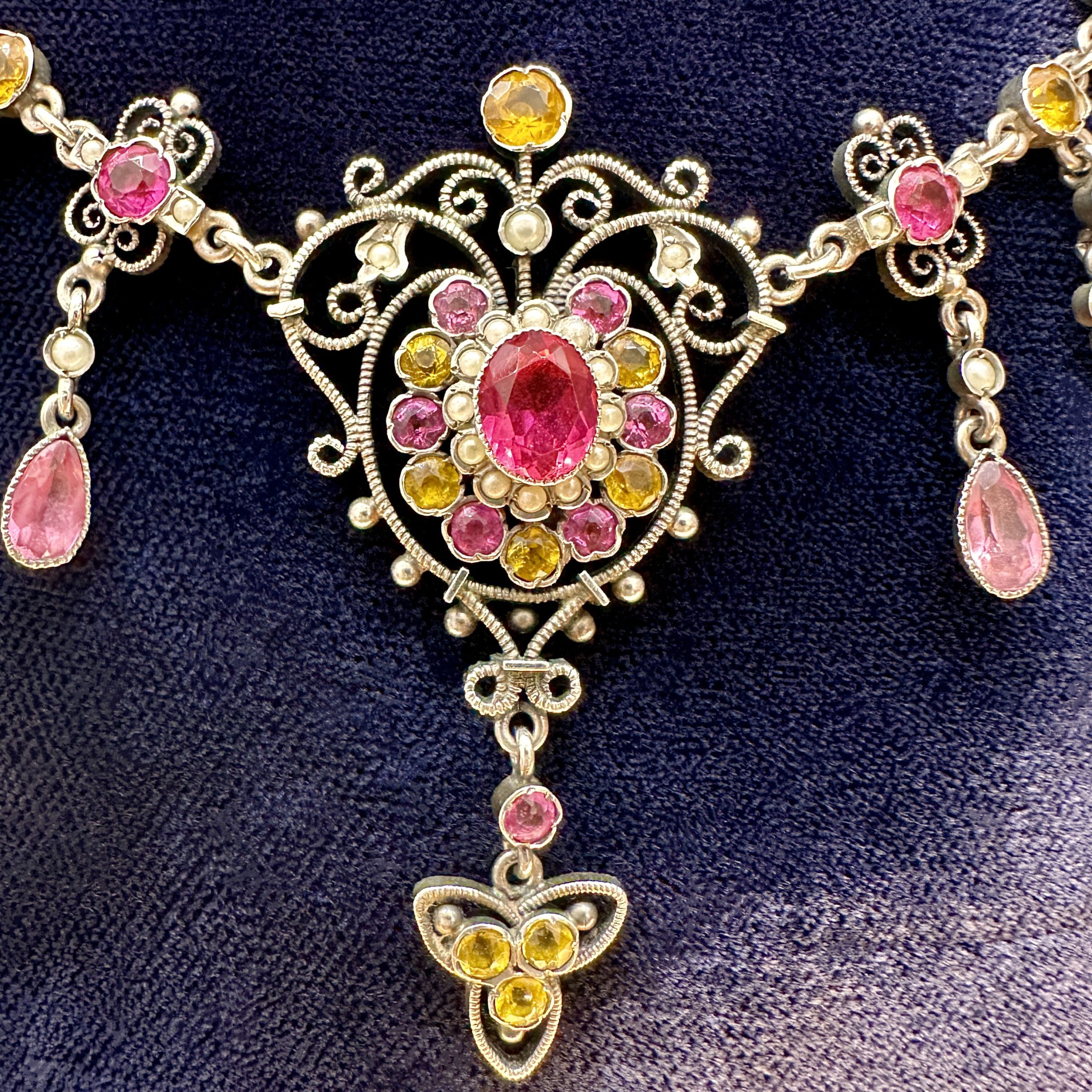 • Handmade in sterling silver – as marked on clasp – set with pink, yellow and pearl antique paste