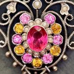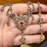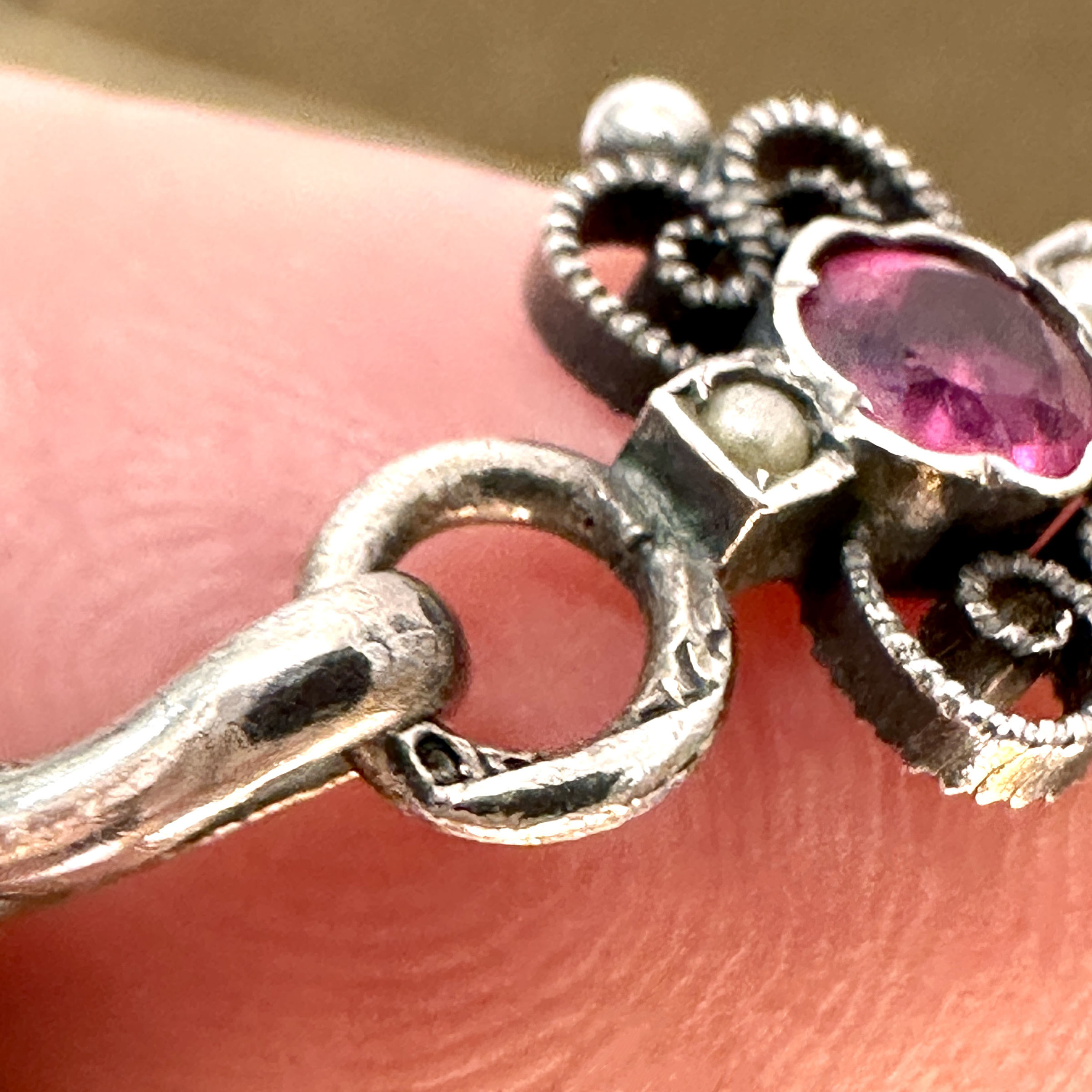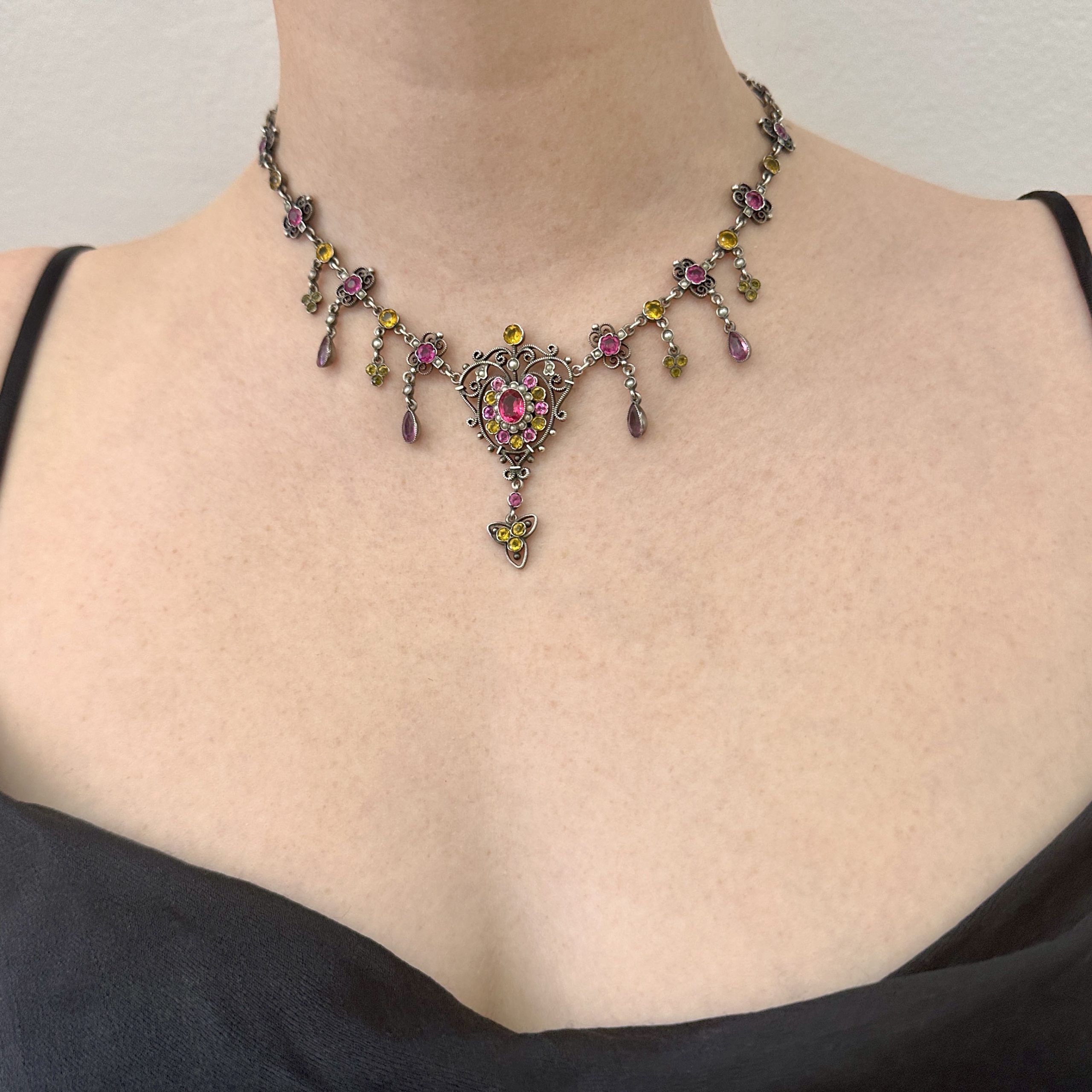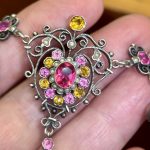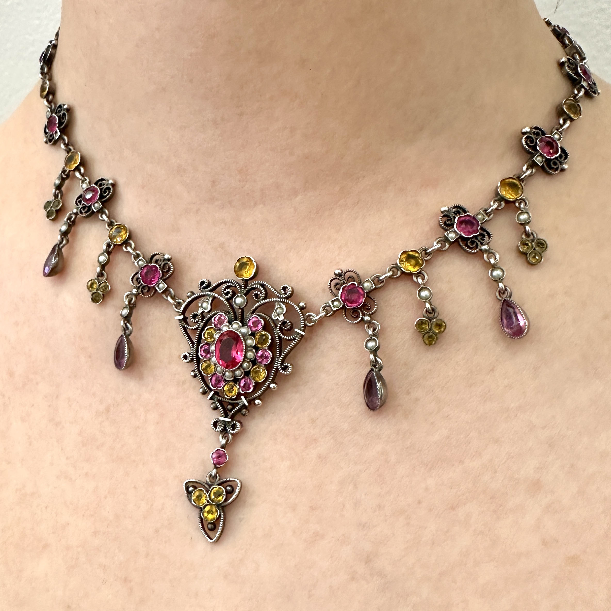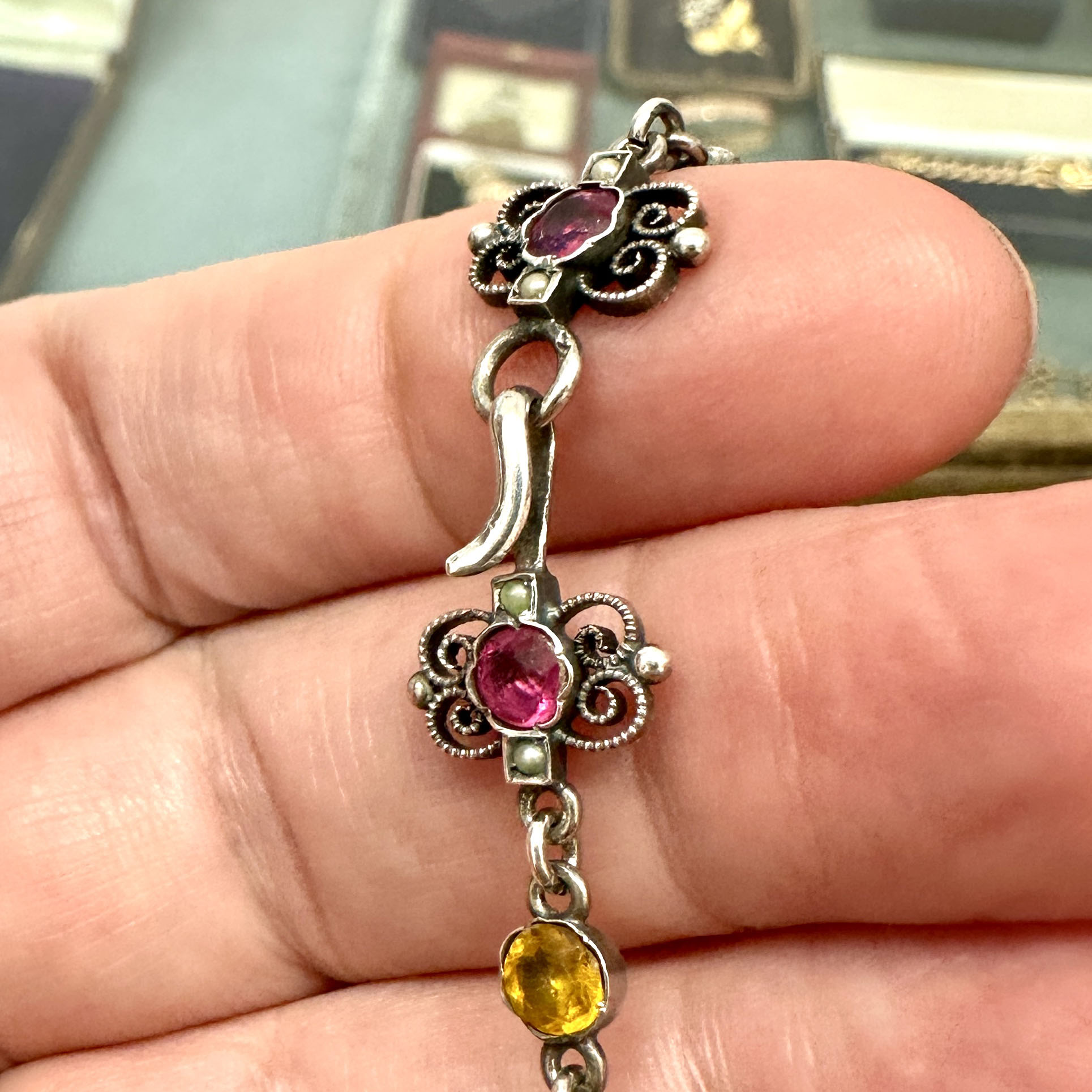 • Handmade in sterling silver – as marked on clasp – set with pink, yellow and pearl antique paste