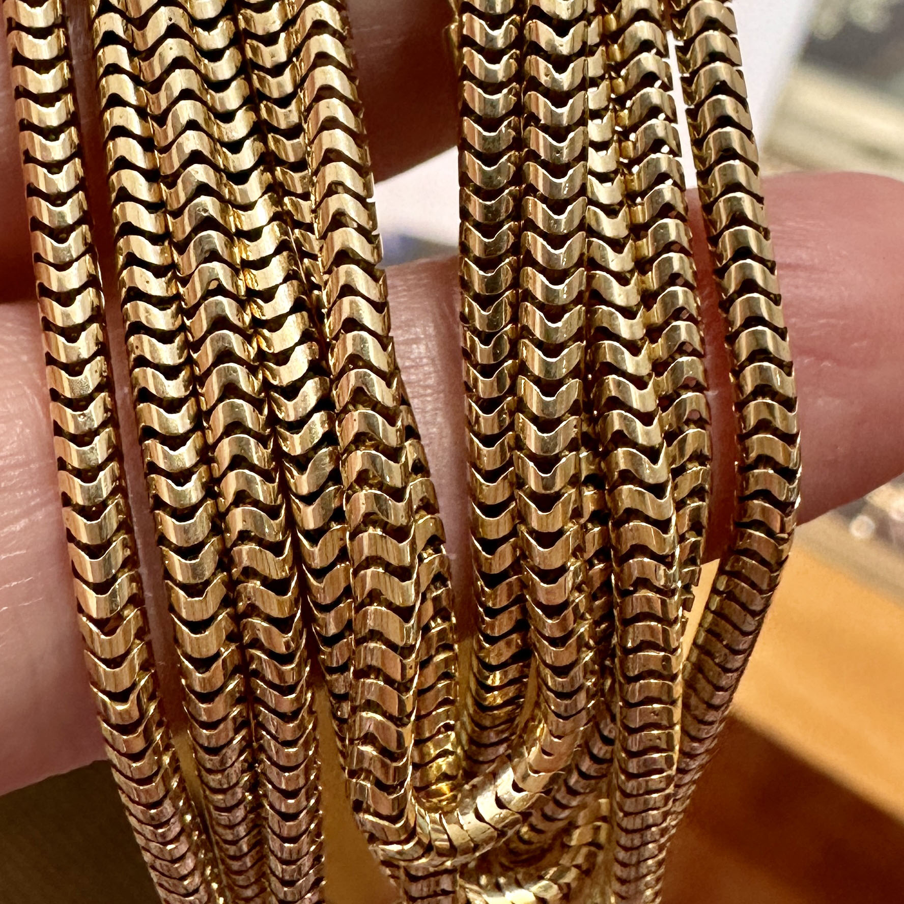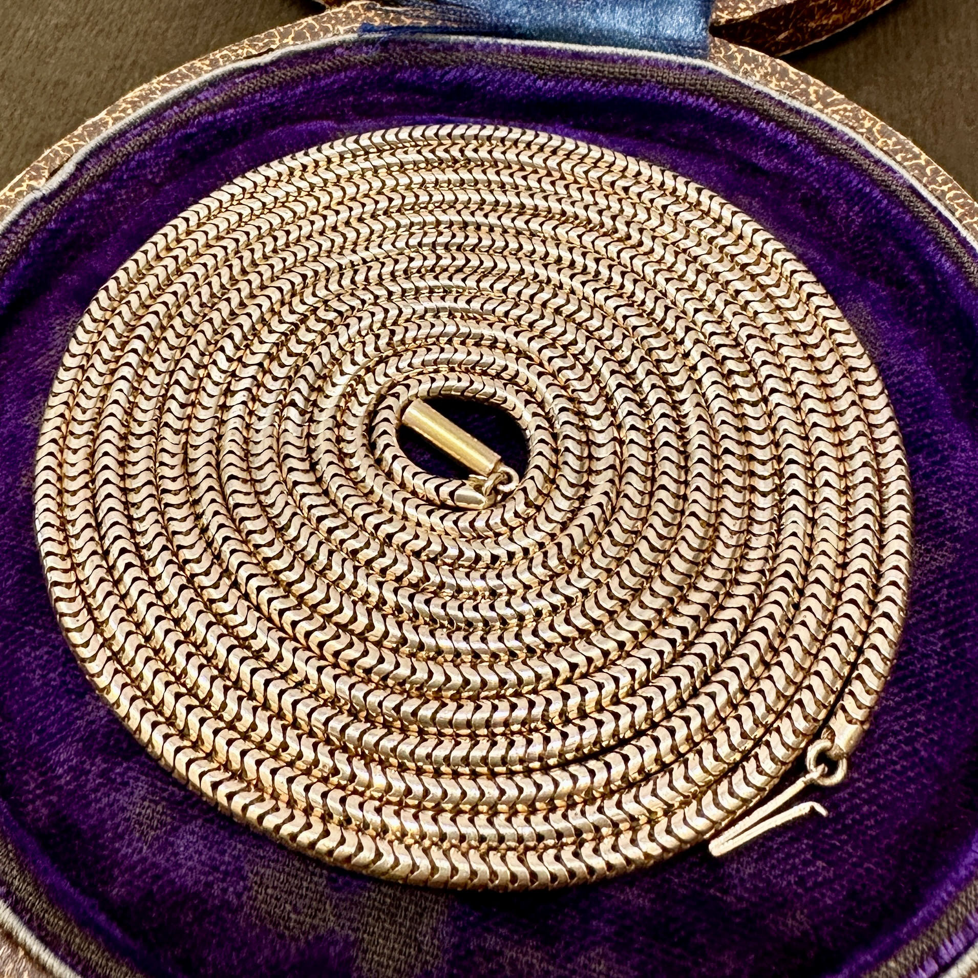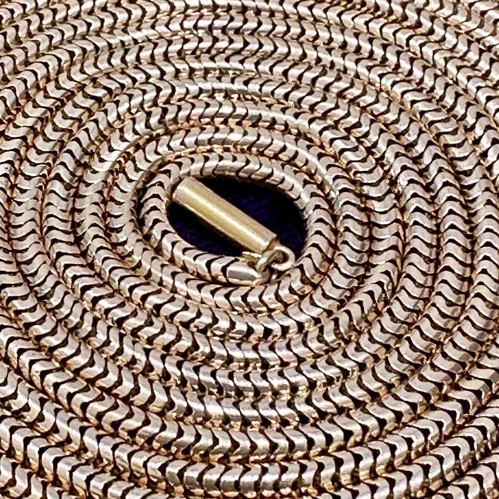 This wonderfully silky, slinky Brazilian/snake link guard chain was handcrafted in the late Victorian era, about 1900.