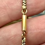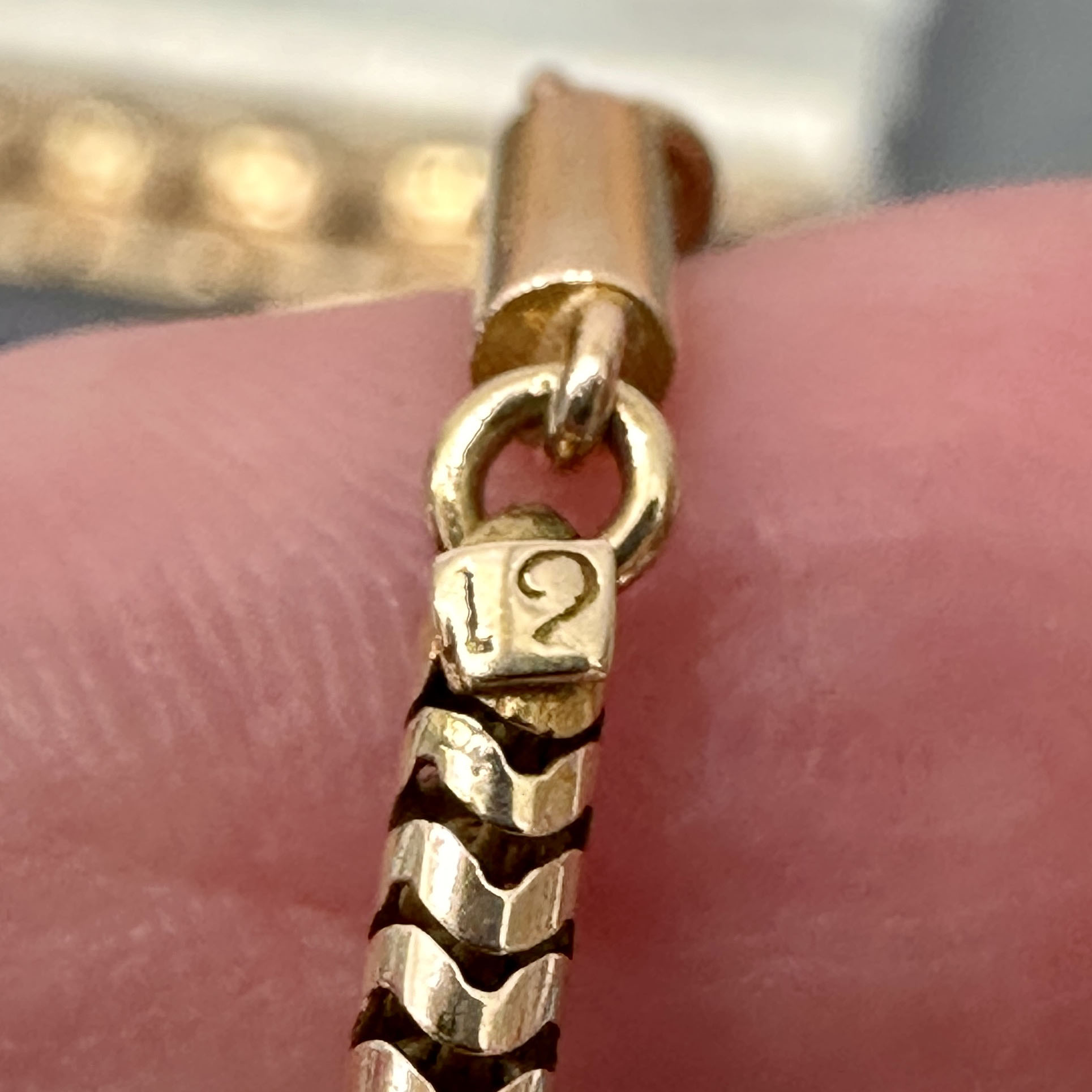 The gold is yellow in some lights and has a rosy tinge in others. XRF testing shows it to be 11-carat, though the chain bears a 12-carat mark.