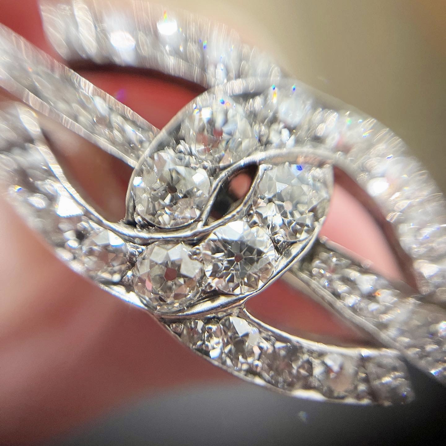 It contains more than three carats of well-matched white and bright old cut diamonds, tapering in size from the four central stones – which are each about half a carat in size.