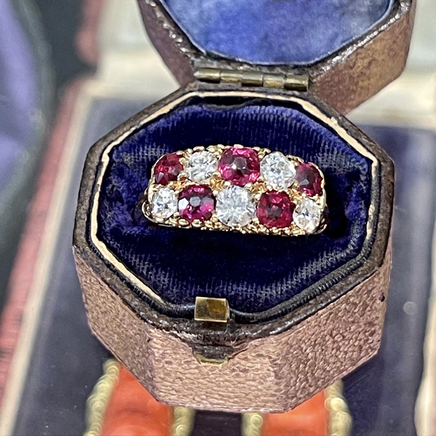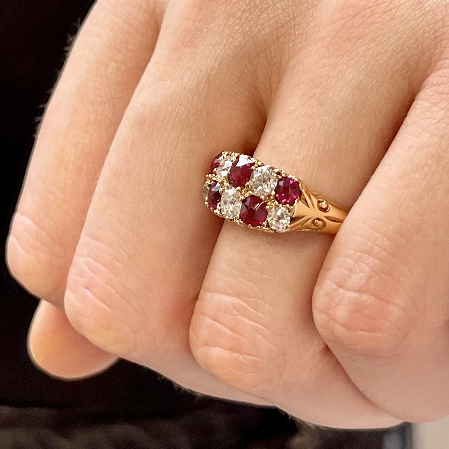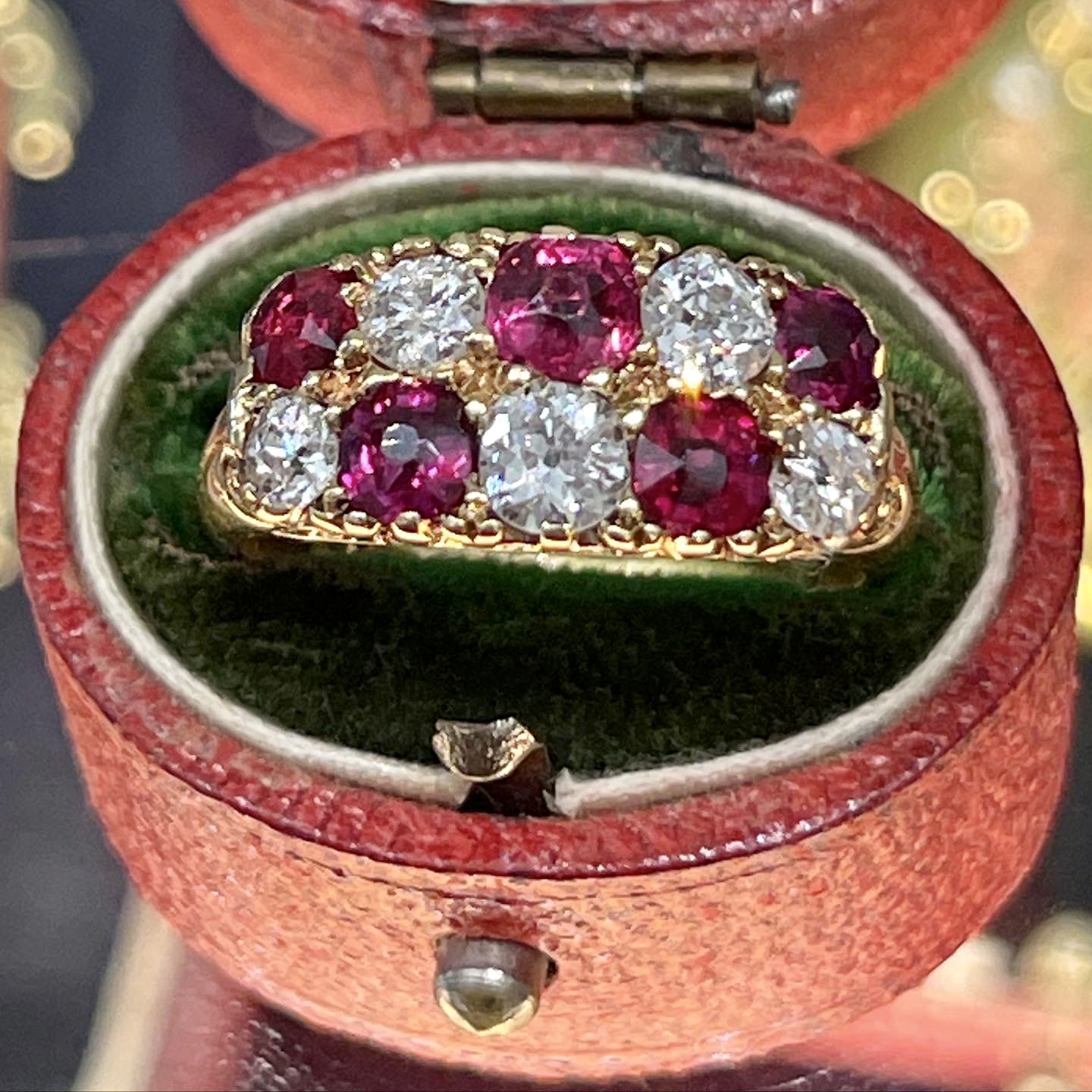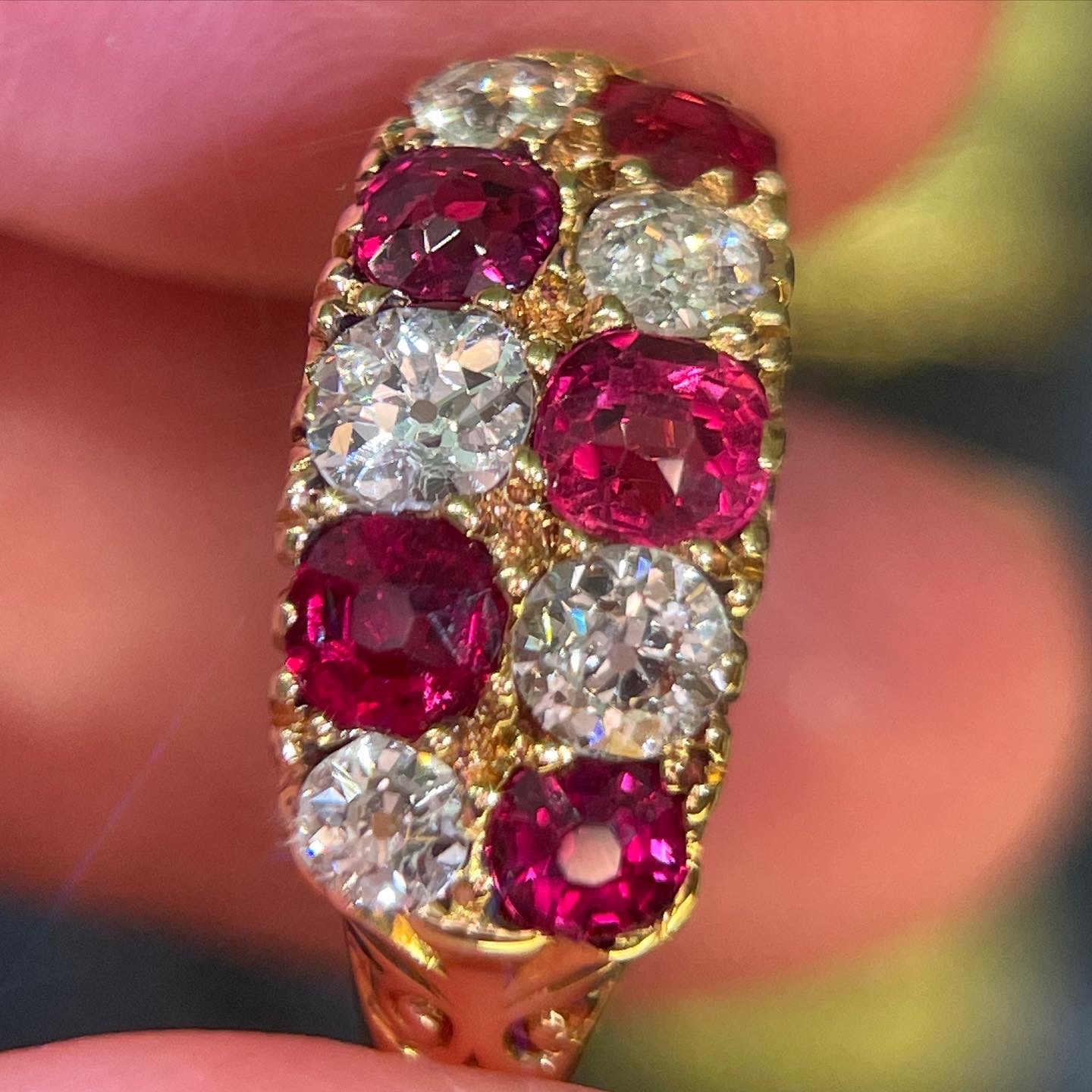 There’s a lot to love in this antique two-row ruby and diamond ring made in Birmingham in 1893.
