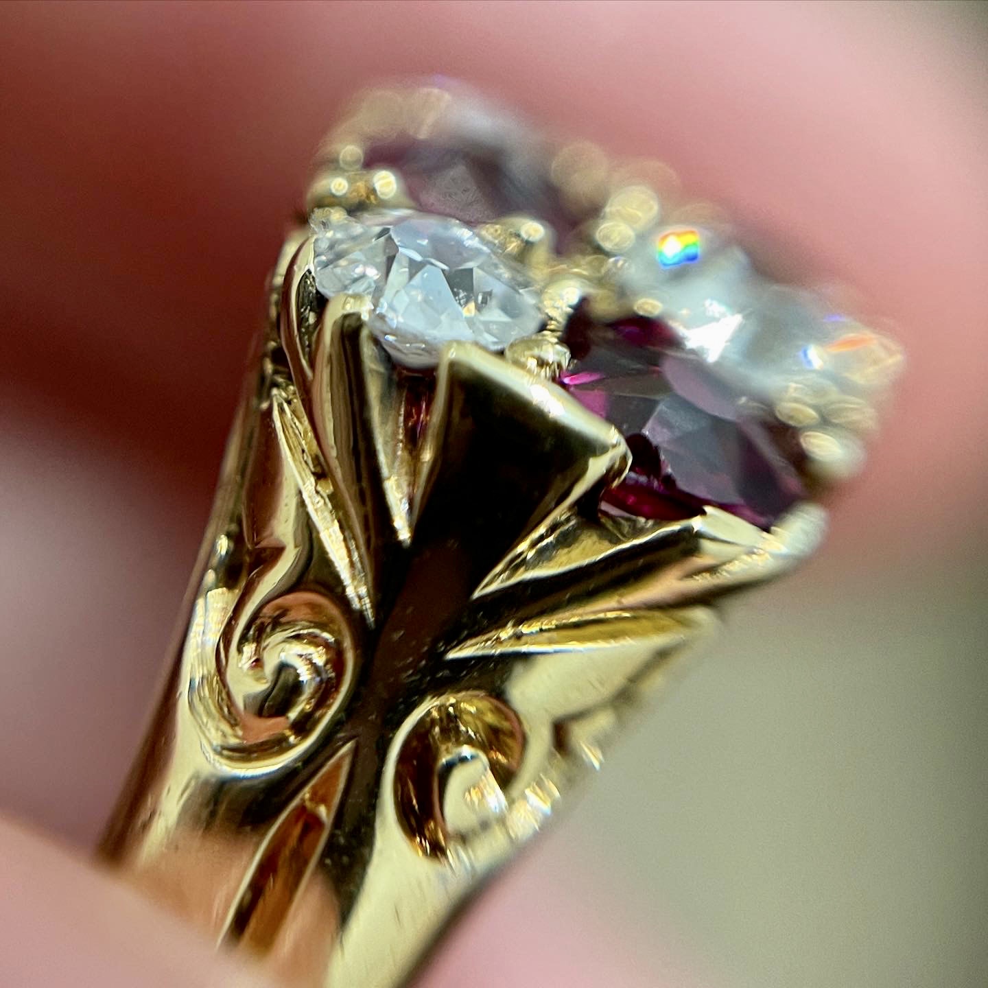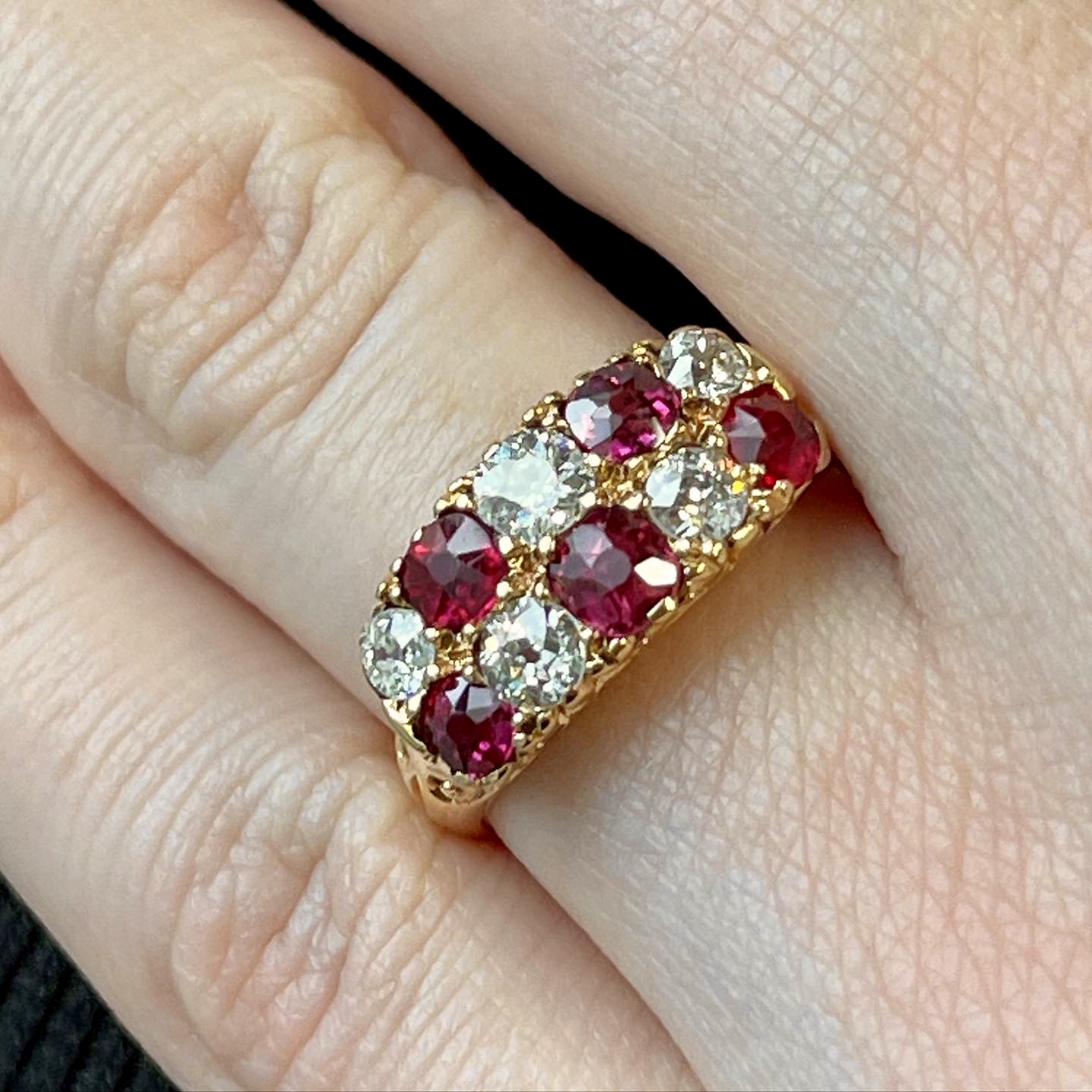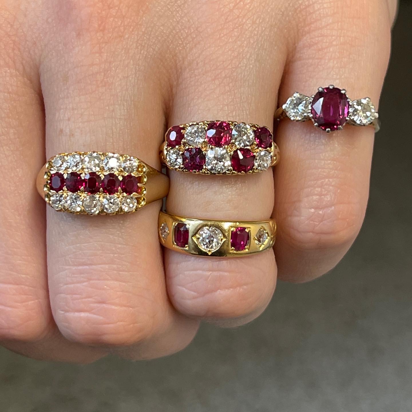 There’s a lot to love in this antique two-row ruby and diamond ring made in Birmingham in 1893.